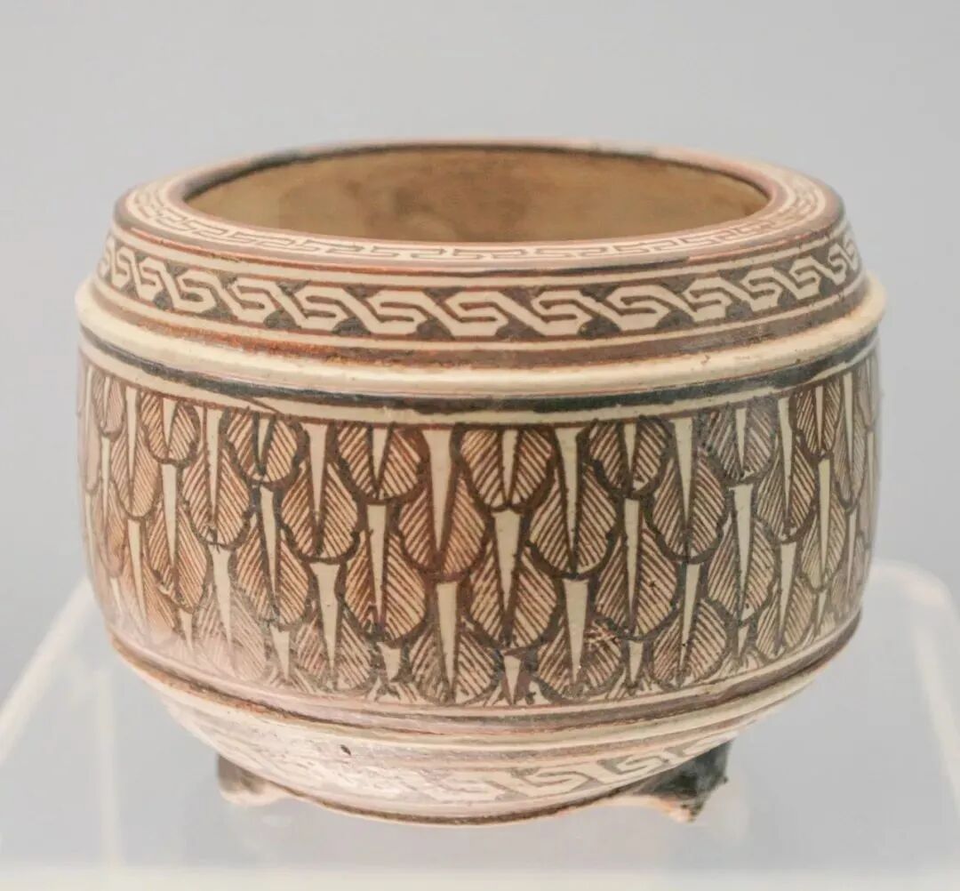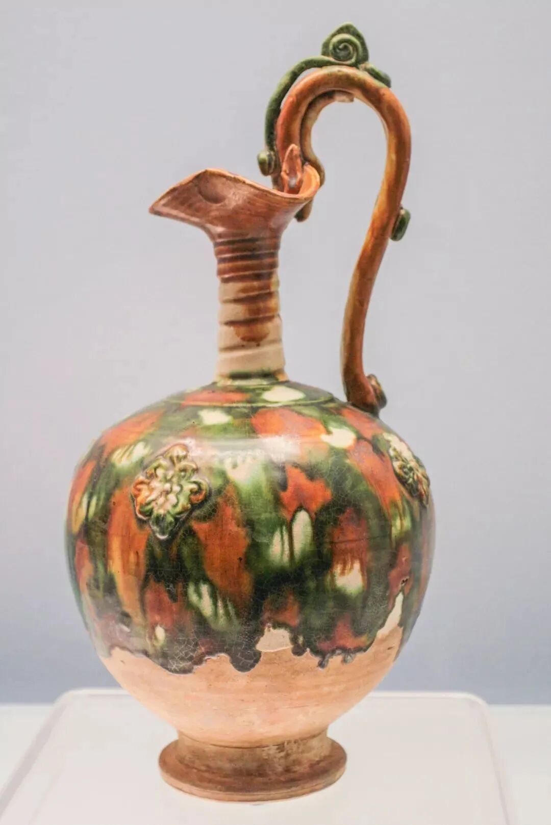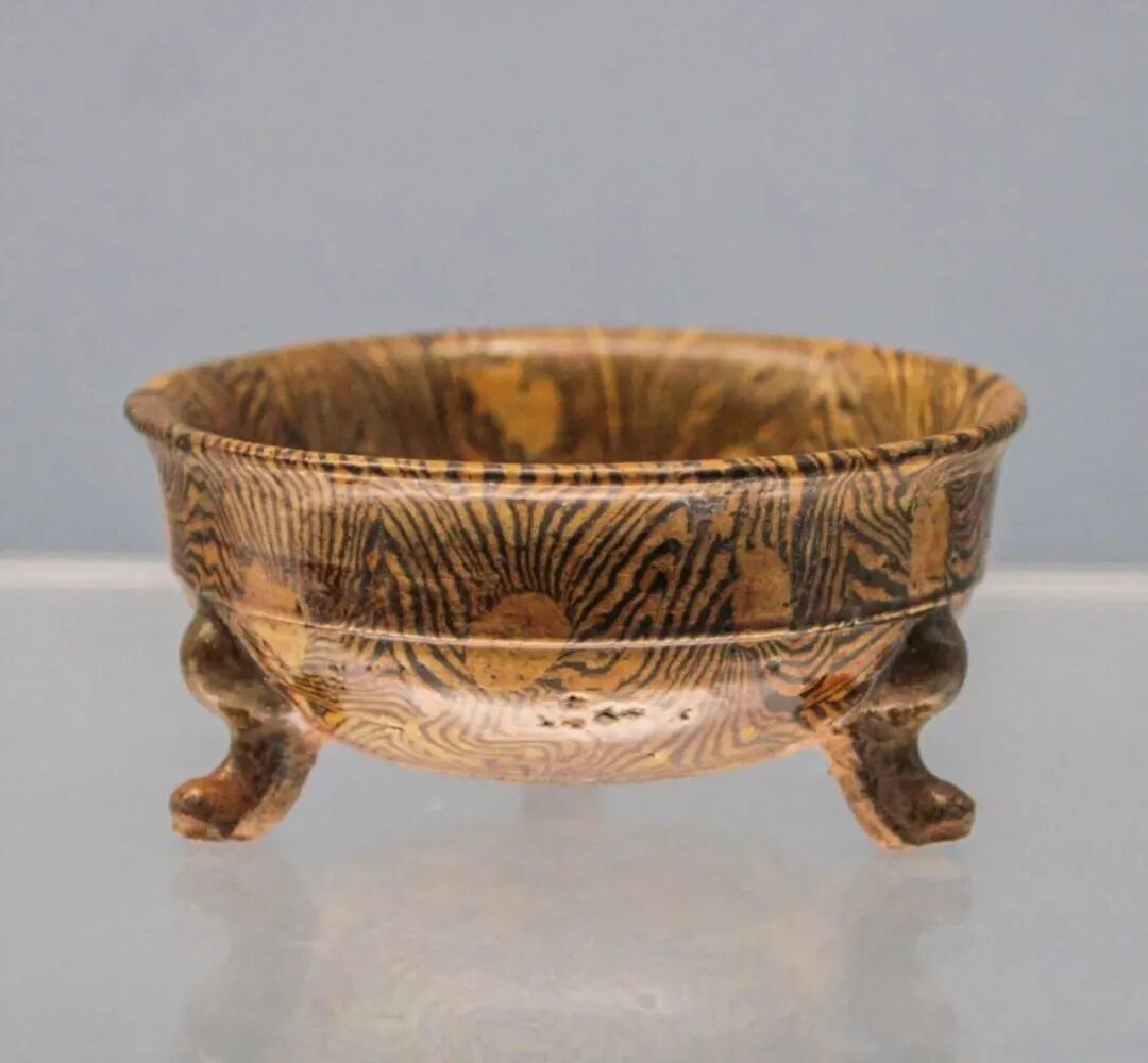 绞胎是唐代一种新颖陶器制作工艺。制作方法系用白、褐两色(或多色)陶土相间糅合、按需要切成片后贴于器物表面,有的产品整器胎体相绞而成,然后施釉烧造而成。纹饰多样化,最常见的是木理纹,颇有特色。