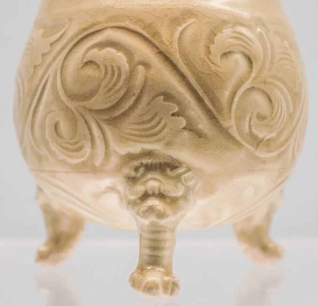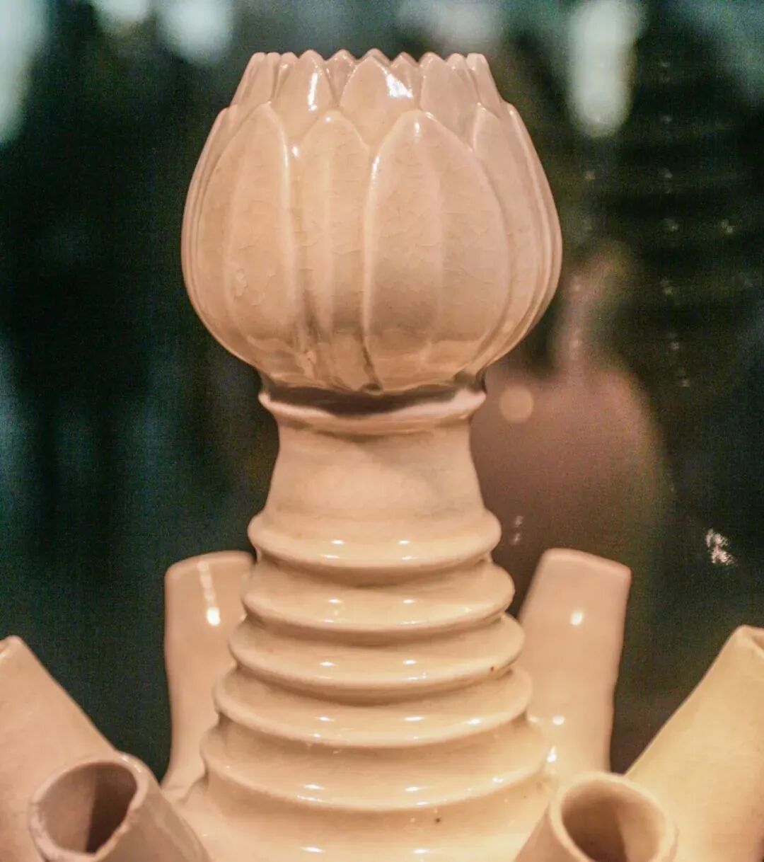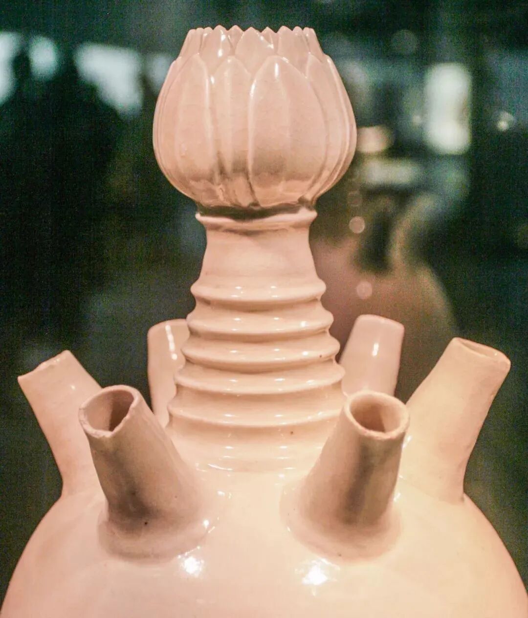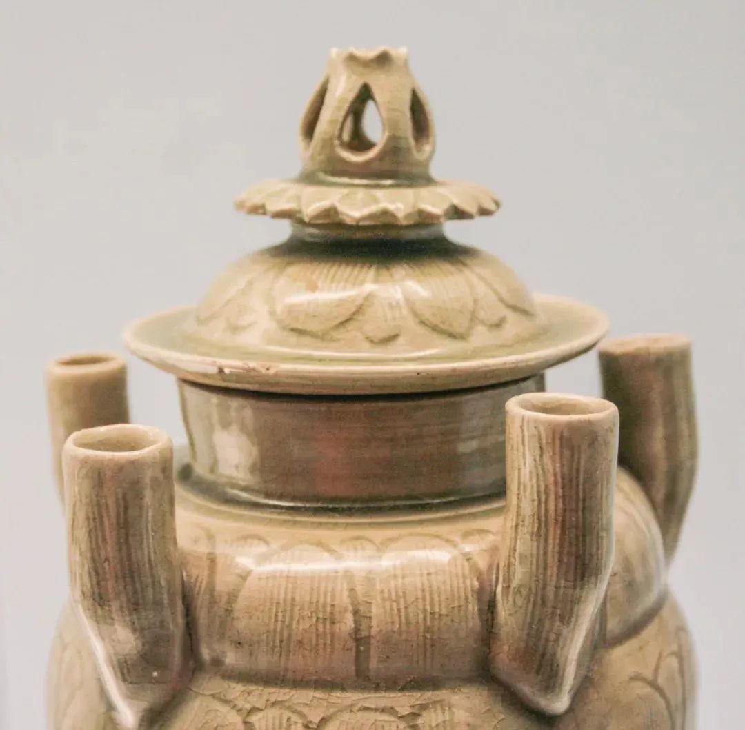 龙泉窑青釉刻花莲瓣纹五管盖罐局部