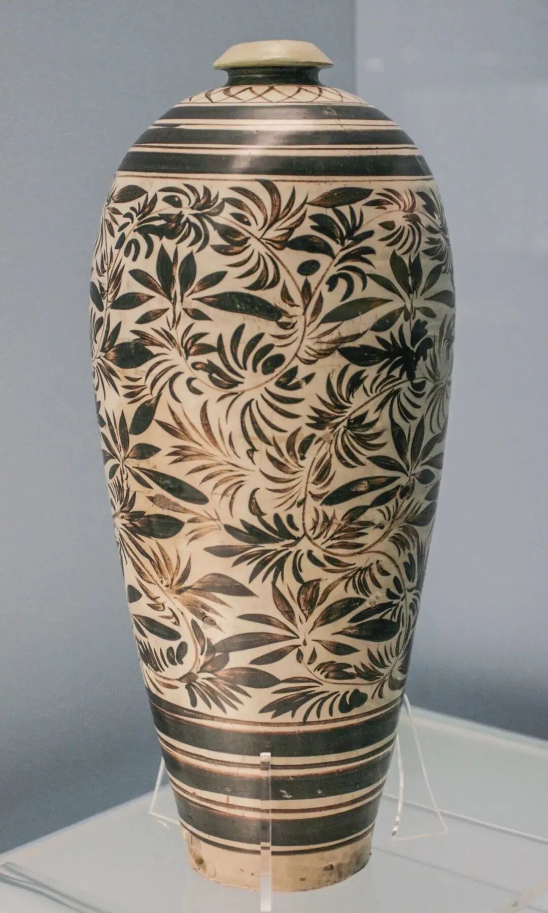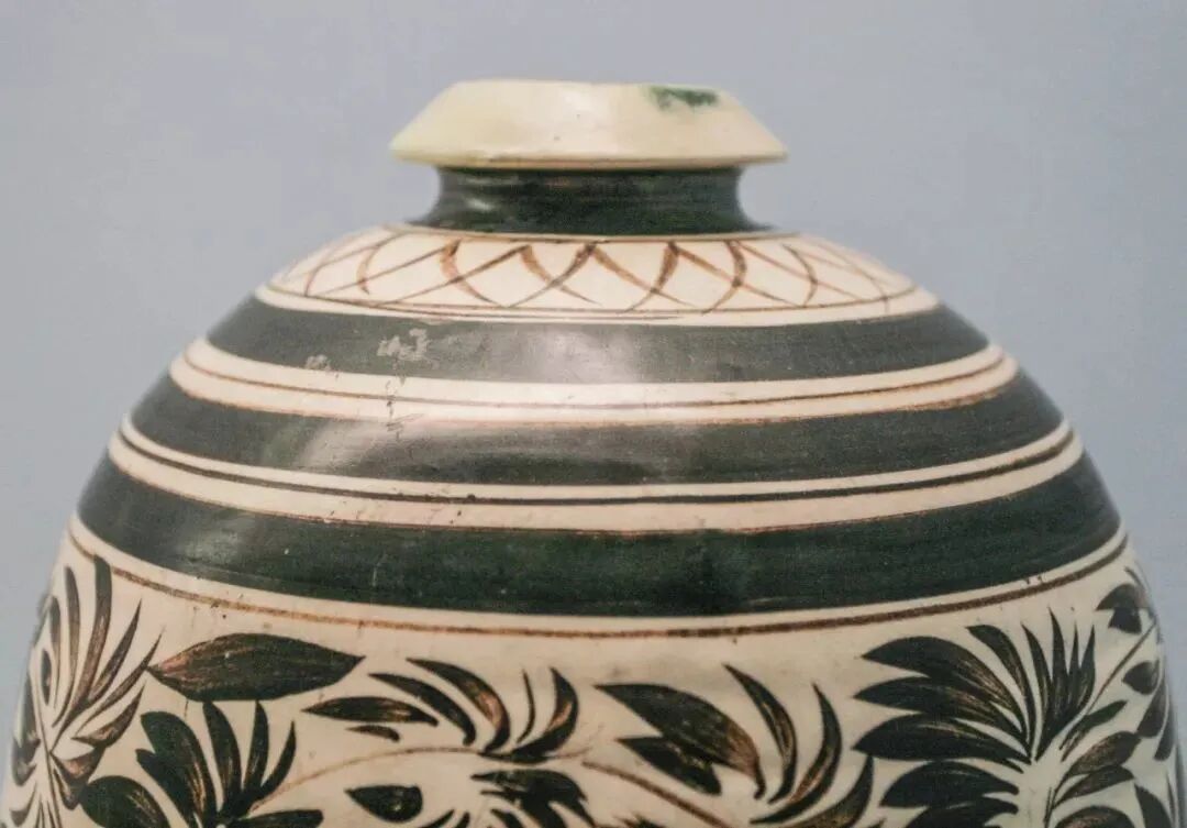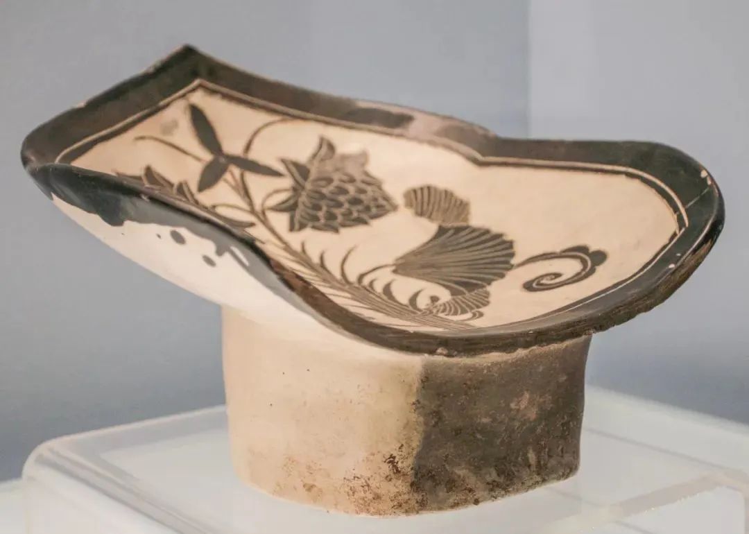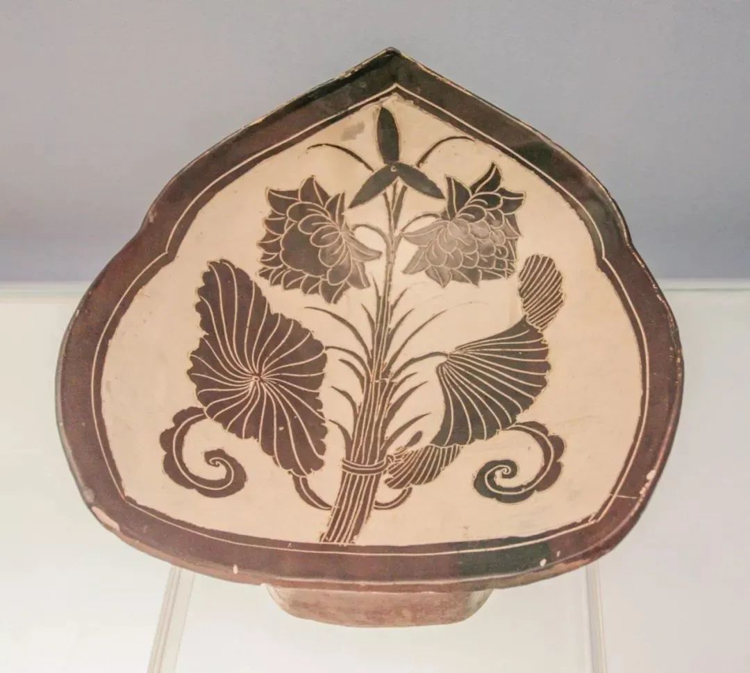 地处江西吉安永和镇的吉州窑,为宋代南方重要瓷窑。所烧产品有青白瓷、黑釉瓷、彩绘瓷等,尤以后二者最为著名。黑釉瓷采用贴花、刻花、彩绘、洒釉等方法,创作出许多别致而又自然的纹饰,特别是木叶纹和剪纸贴花工艺,具有独特的艺术风格。彩绘瓷基本仿效磁州窑,但器身不施化妆土,外观效果与之不尽相同。