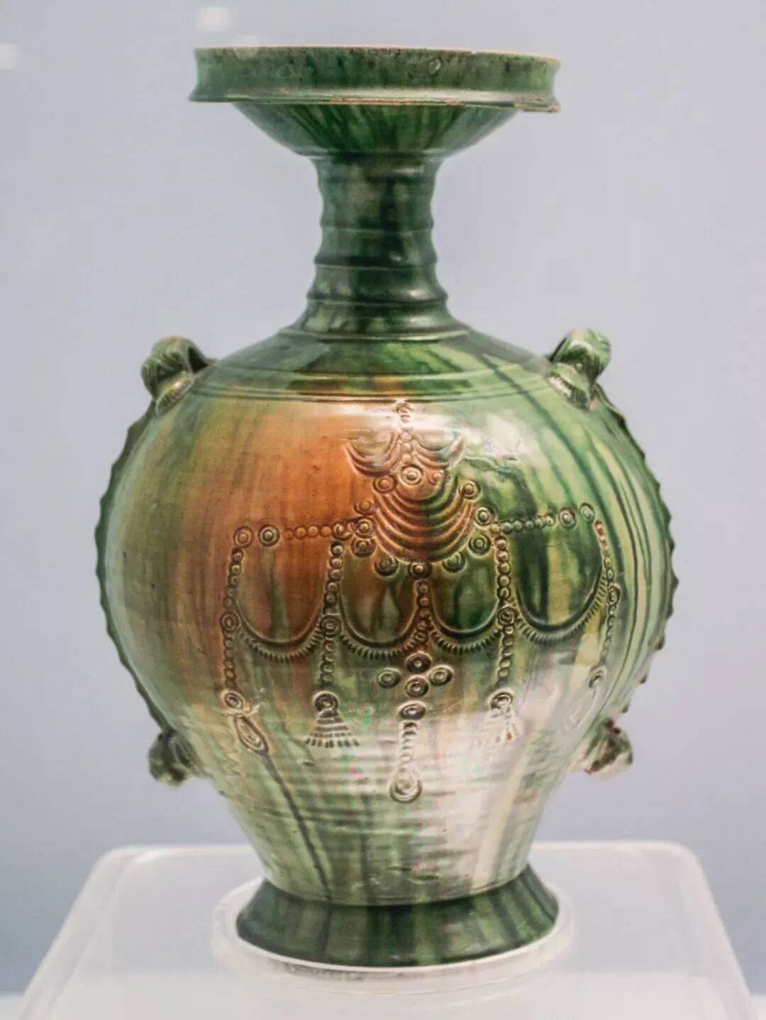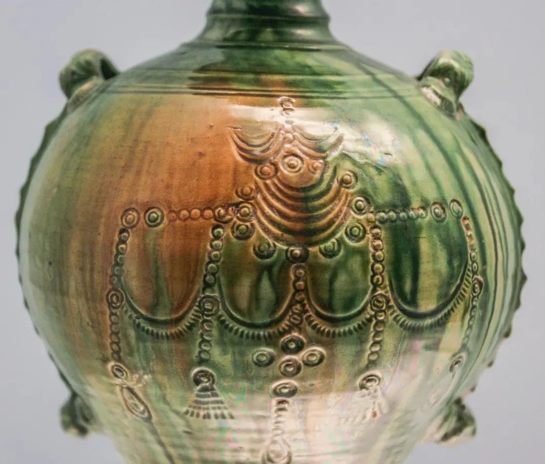 彩色釉刻花璎珞纹盘口穿带壶局部