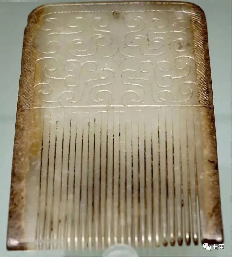 ▲东周云纹玉梳,此展品为东周(战国早期)文物。长9.6厘米,通宽6.5厘米。这把玉梳放置在曾侯乙的头部下方,梳背双面阴刻云纹,上端中间有一个小孔,可能是丝线系绑之处。梳子是日常生活用具,以玉梳陪葬,反映了古人事死如事生的观念。1978年出土于湖北省随州市擂鼓墩1号墓。现收藏于湖北省博物馆。