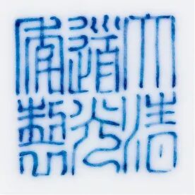 本品作灯笼形,造型典雅规整,通体以青花饰以夔龙纹,夔龙蜿蜒盘踞于腹各处,气势威猛,姿态各异。头生卷角,鼻长如象,足尾若卷草,背似生灵芝,炯炯有神,浑然一体。周身环视祥云,交迭悬停,愈显得神龙腾云驾雾,皇家气势神圣不可侵犯。底以青花书“大清道光年制”六字三行篆书款。