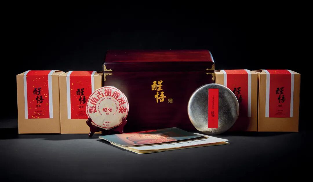 茶叶原料选用树龄六百年以上的云南古树茶芽叶,采用班章、易武、冰岛、景迈等古树茶进行拼配,于2010年以石磨压饼工艺制作而成,经干仓仓储转化,独具太阳蜜香、刚柔甜活的绵长滋味和越陈越香的品质特征。『醒悟』系列荣获2014年中国APEC首脑峰会大国之礼,2019年第二届进博会中法两国领导人豫园茶叙专用茶。