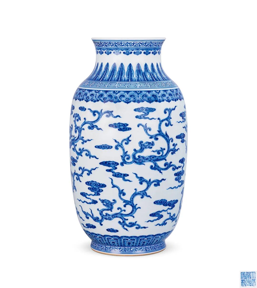 此件灯笼瓶正是道光御瓷颇为珍罕之器,其造型典雅尊贵,胎釉细白坚致,青花明快妍丽,所绘之夔龙穿云图,为道光御瓷之少见,绘工精湛,状物有神,夔龙威武遒劲之势,予人以无限震撼之感,是为道光御窑无上逸品,品格之高丝毫不让慎德堂之御瓷。
