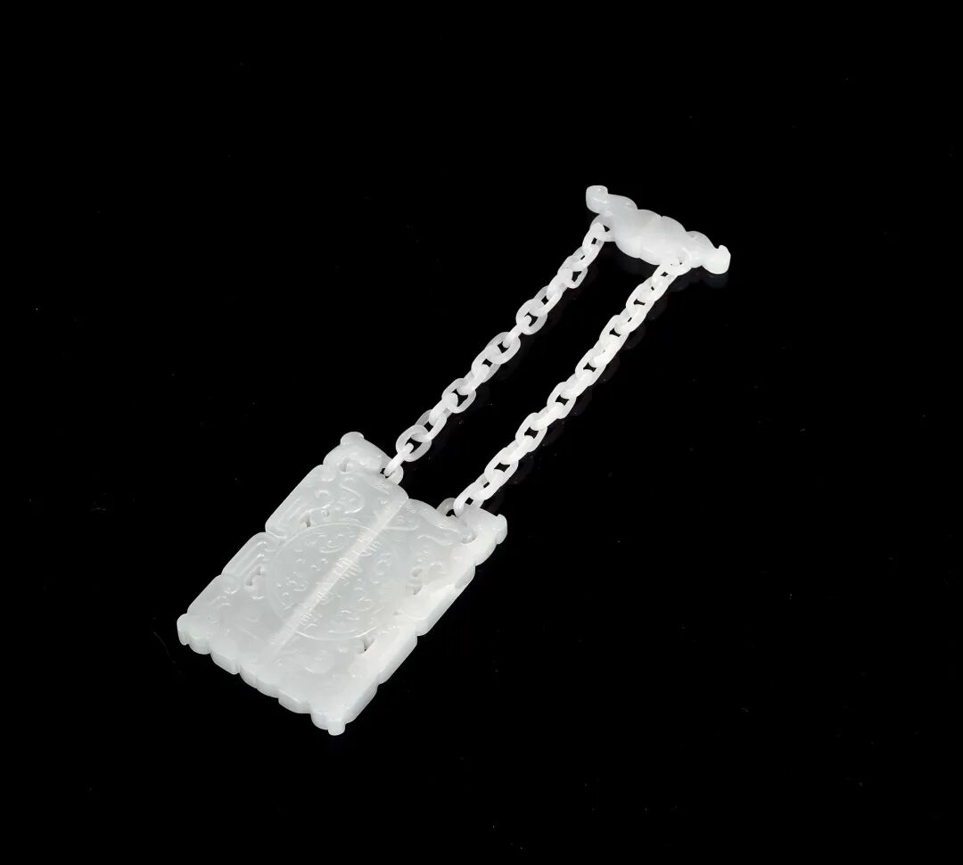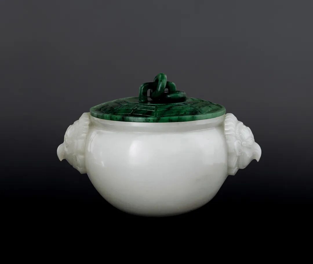 罐身为和田白玉质,质温润。罐身饱满圆润,素面无纹,两侧高浮雕伽楼罗鸟首,尖喙圆眼,羽翼纤细毕现。罐盖为和田碧玉,上圈琢道教八圭纹一组。整器规整豪华,是道教重要礼仪用具。