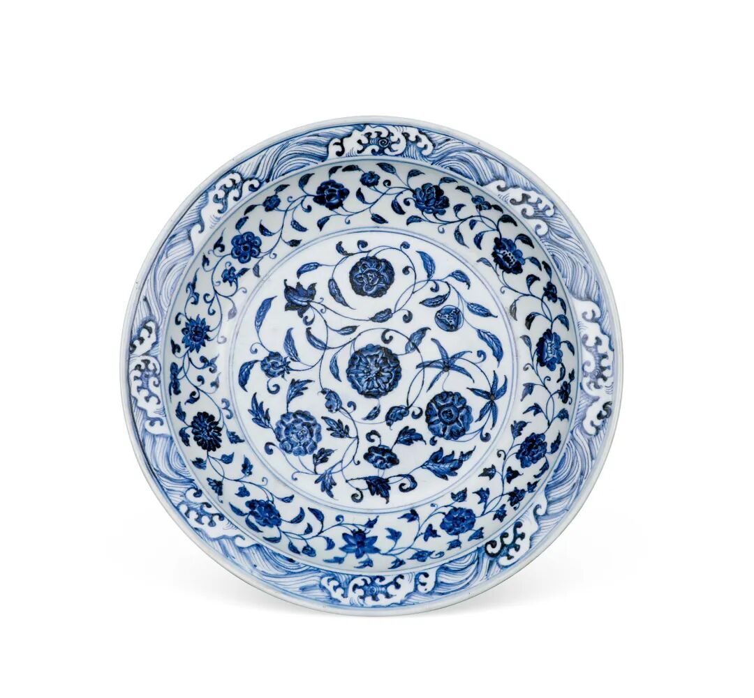 且参考纹饰相仿但折沿饰卷莲纹之永乐大盘,售于伦敦苏富比1972年3月14日,编号132,后再售香港苏富比1976年11月29日,编号463及2009年4月8日,编号1670,曾展于《Chinese Art from the Reach Family Collection》,Eskenazi,伦敦,1989年,编号35。