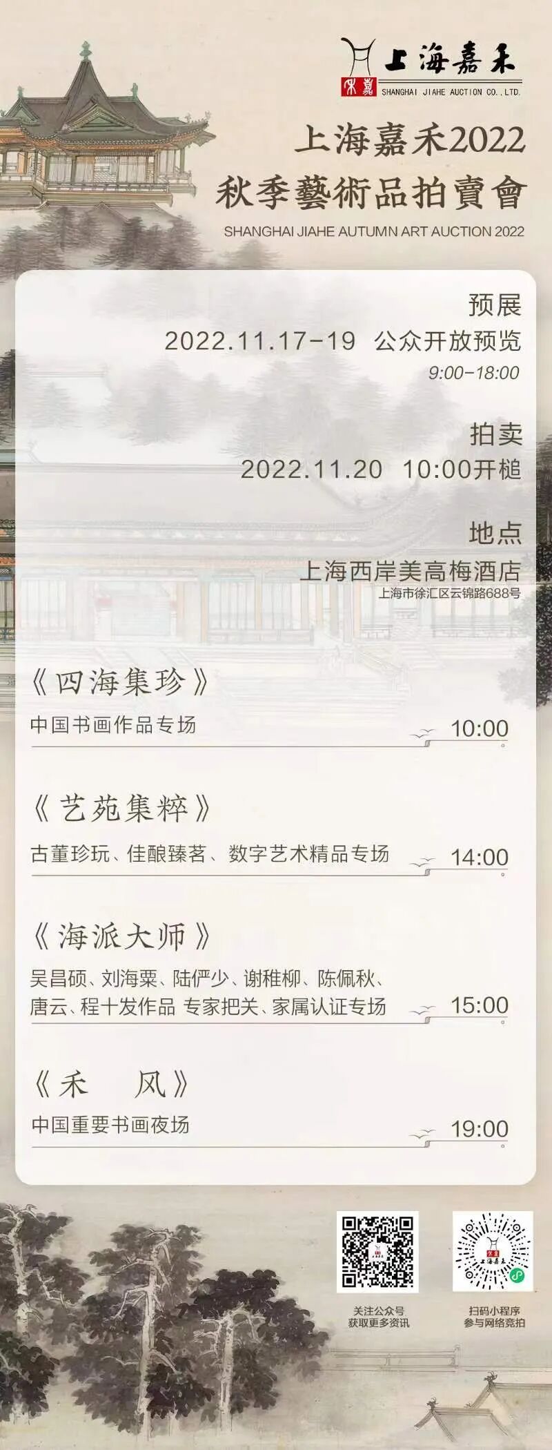 上海嘉禾精心筹备,上海嘉禾·西岸2022秋季艺术品拍卖会将于11月17日—11月19日在上海西岸美高梅酒店(上海市徐汇区云锦路688号)开放公众预展,11月20日上午十点正式开槌!