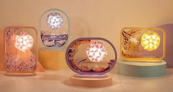 纸艺激光雕刻技术把每个设计细节都剪裁的很细致,灯光透过细致雕刻的纸片,在桌面上铺撒一副朦胧浪漫的光影交错画,氛围感满的好像要从屏幕里溢出来。