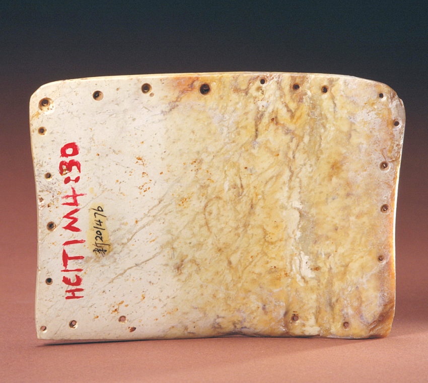 目前,多处红山文化遗址中出土了这类器型,它表现的是一种神化了的动物,反映了较大范围的动物崇拜。颈部带有双孔的作品并不多见,此玦可能是制造时所穿之孔位置不理想,作品悬挂时倾斜度不合要求,于是又钻了第二孔。这件作品为清代宫廷遗玉,说明清代宫廷曾收藏红山文化玉器。"