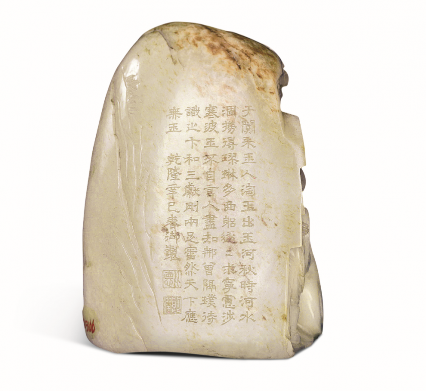 高12cm,宽28.5cm,厚9.4cm。青玉山体正面雕羲之爱鹅故事图像,背面岩石间点缀灵芝数枚、兰花数丛。清代山子因为体量相对较大,多采用新疆山料制作,以青玉居多。"