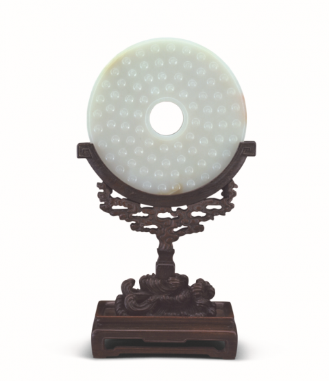在清宫仿古玉器中,以古玉为蓝本的玉器为数不少。此器仿战国时期的玉璧,但在花纹装饰上按照清代的审美观进行了不小的改动。"