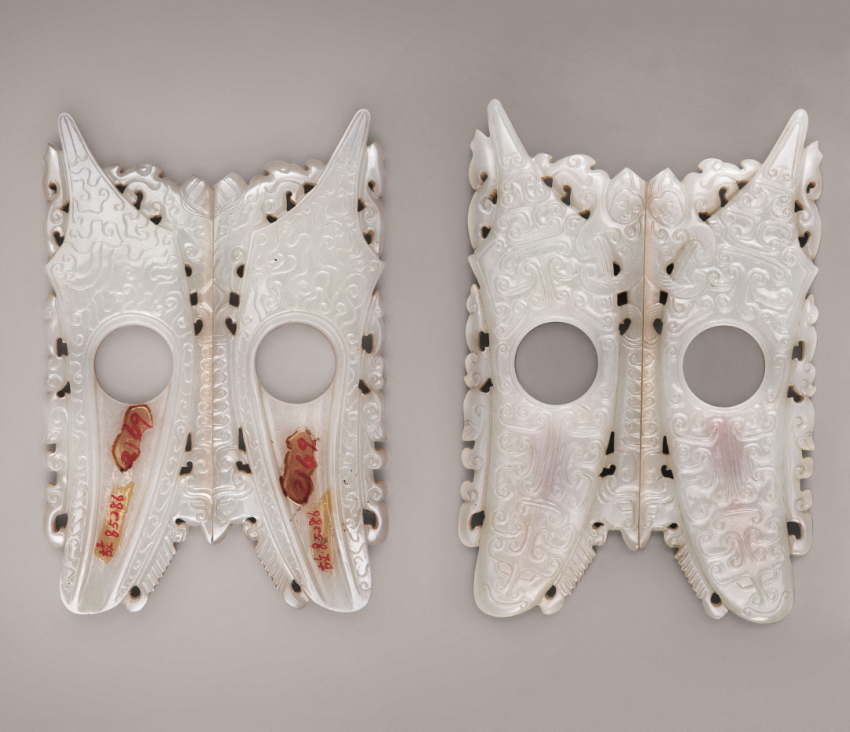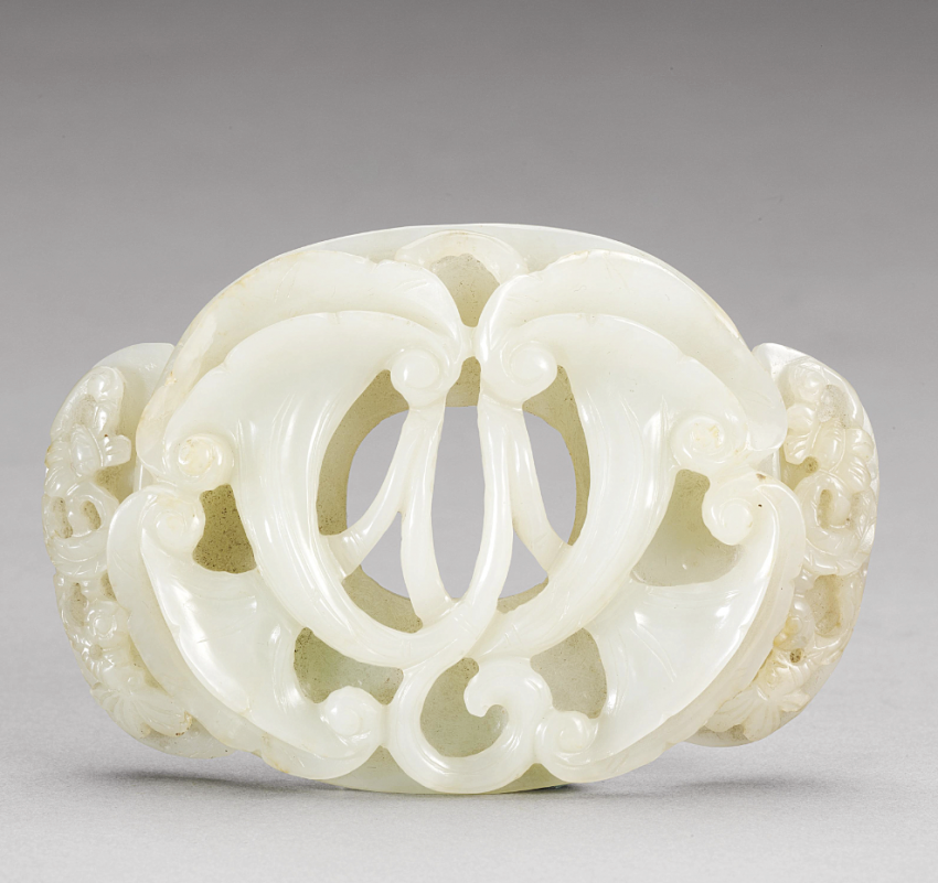 长12cm,宽8cm,厚3cm。带饰青白玉质,器表抛光精亮。器物在椭圆形环璧上,高浮雕4朵盛开的凌霄花,花枝交叉环绕。圆环背面凸起两桥形鼻纽,分别套连两椭圆环,环上为半月形托,托上浮雕蝶恋花图案。