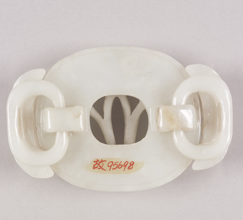 此器为一块整玉雕琢而成,半月形托与椭圆环之间有穿,可穿带而过。从器型看,应为丝绦带上的绦环。此玉带饰原藏紫禁城体和殿。"