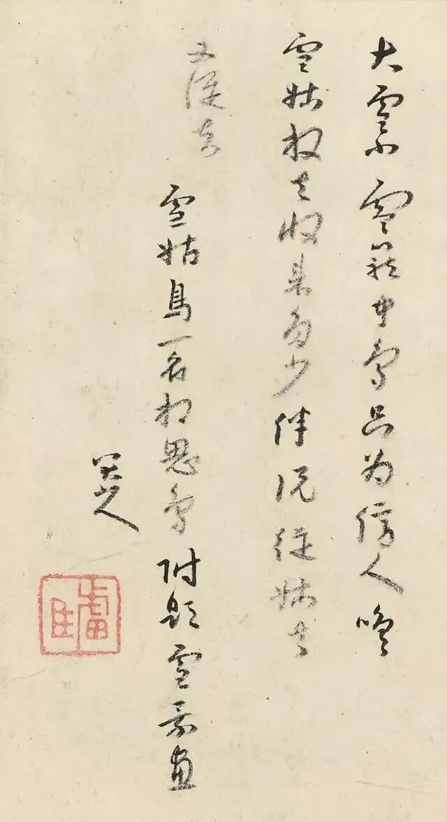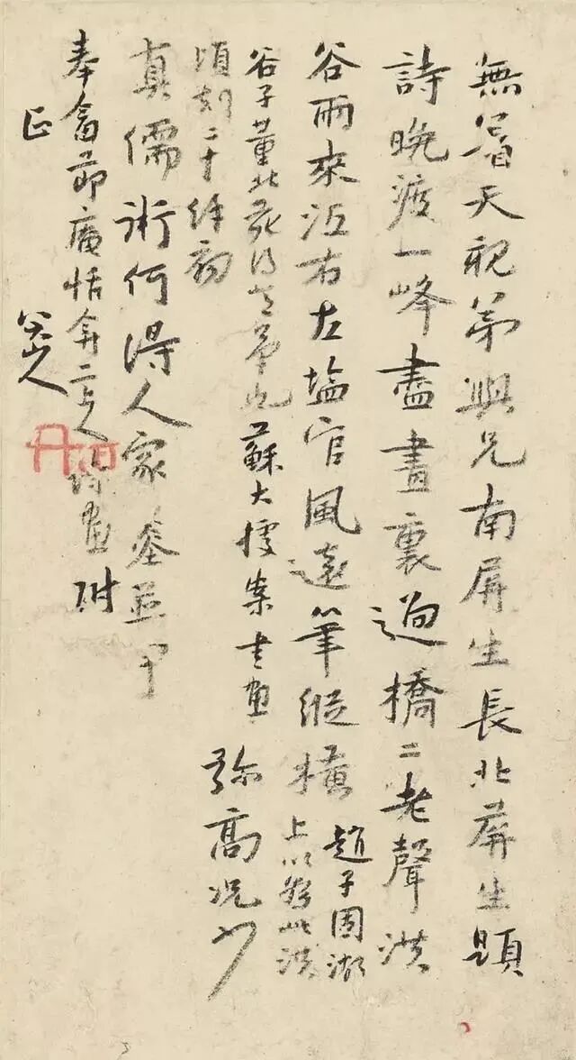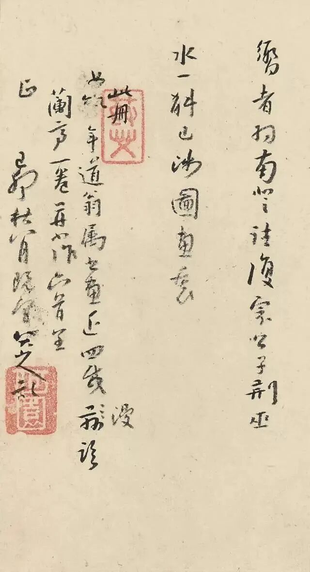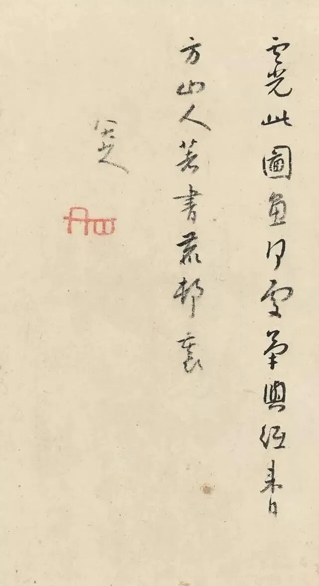 赵子固湖上以为此洪谷子,董北苑得其笔也,苏大据案书画,顷刻二十余扇。弥高况少真儒术,何得人家□并□。奉畣节庵、恬弇二上人诗画附正。