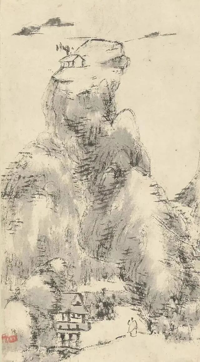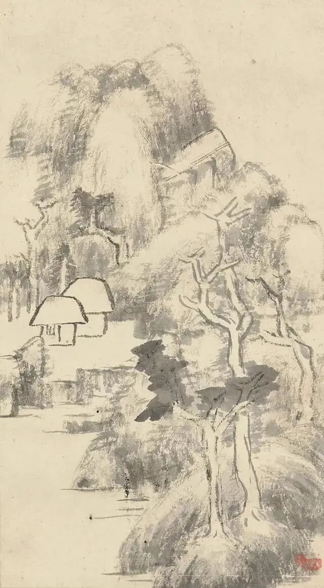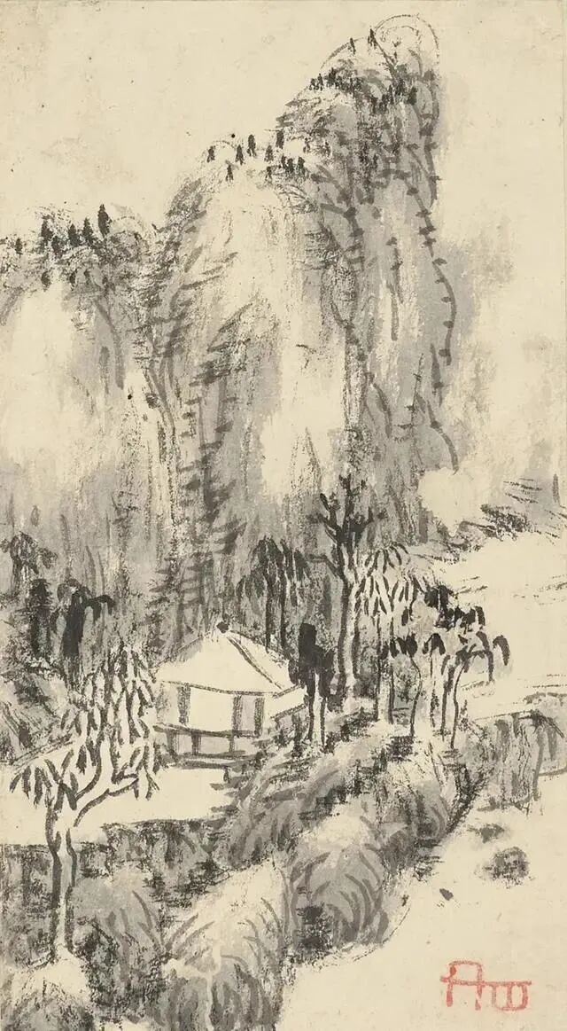《兰亭诗画册》是八大山人晚年之作。画面上,野逸闲笔跃然纸上,他笔下的山、石、树、草,以及茅亭、房舍等,逸笔草草,看似漫不经心,随手拾掇,而干湿浓淡、疏密虚实、远近高低,笔笔无出法度之外,意境全在法度之中。