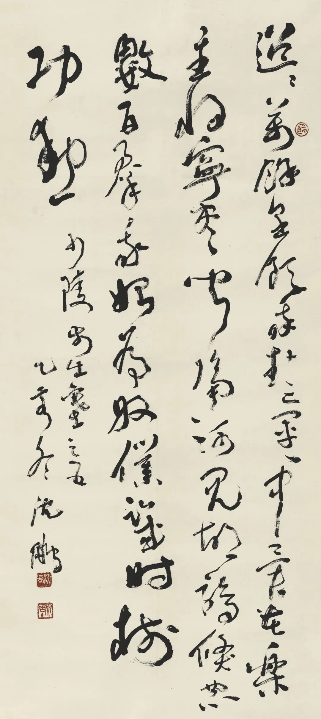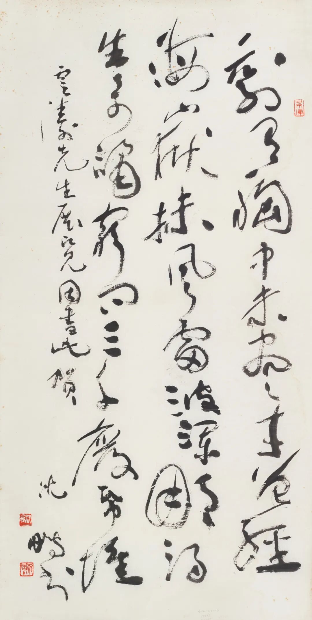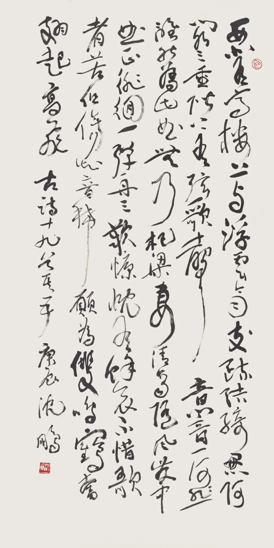 释文:风吹柳花满店香,吴姬压酒劝客尝。金陵子弟来相送,欲行不行各尽觞。请君试问东流水,别意与之谁短长?乙亥秋日书太白《金陵酒肆留别》。沈鹏 。