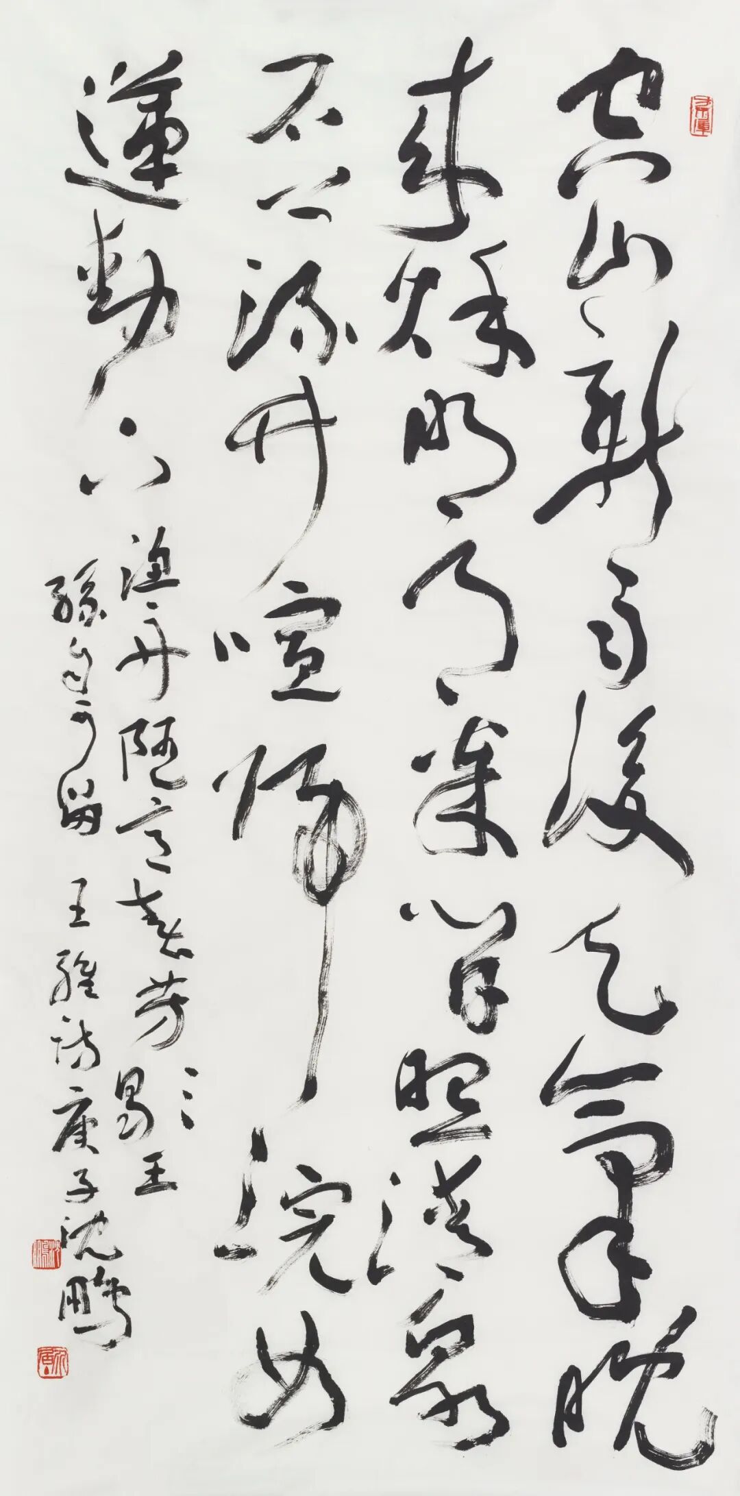 释文:空山新雨后,天气晚来秋。明月松间照,清泉石上流。竹喧归浣女,莲动下渔舟。随意春芳歇,王孙自可留。王维诗,庚子,沈鹏。