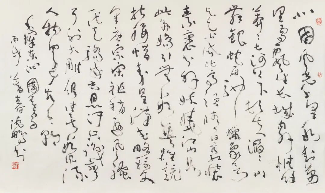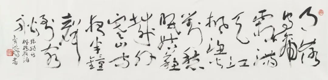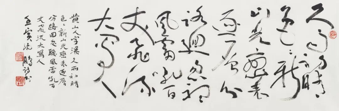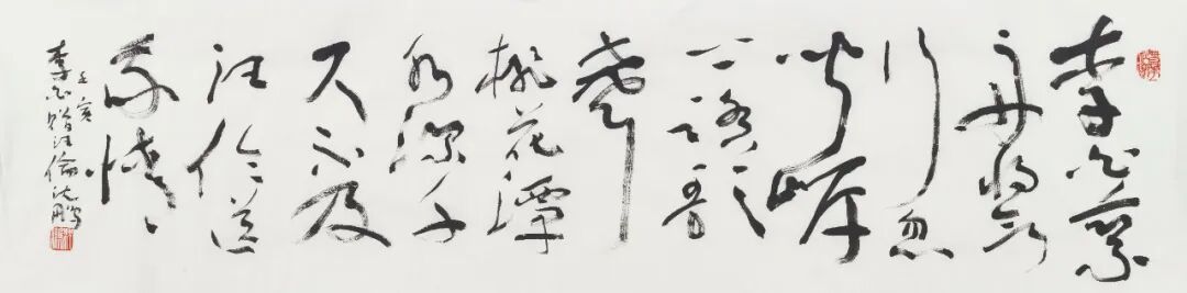 释文:李白乘舟将欲行,忽闻岸上踏歌声。桃花潭水深千尺,不及汪伦送我情。壬寅,李白《赠汪伦》,沈鹏。