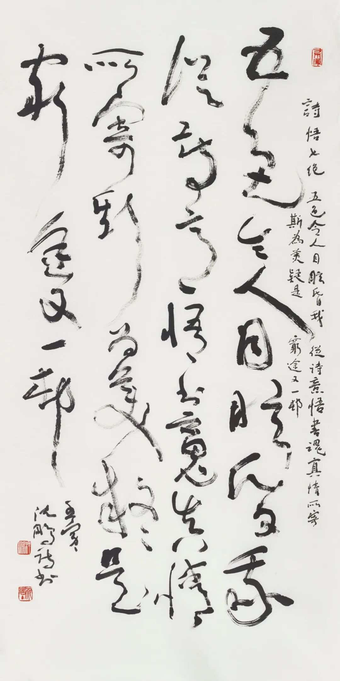 释文:五色令人目眩昏,我从诗意悟书魂。真情所寄斯为美,疑是穷途又一村。壬寅,沈鹏诗书。