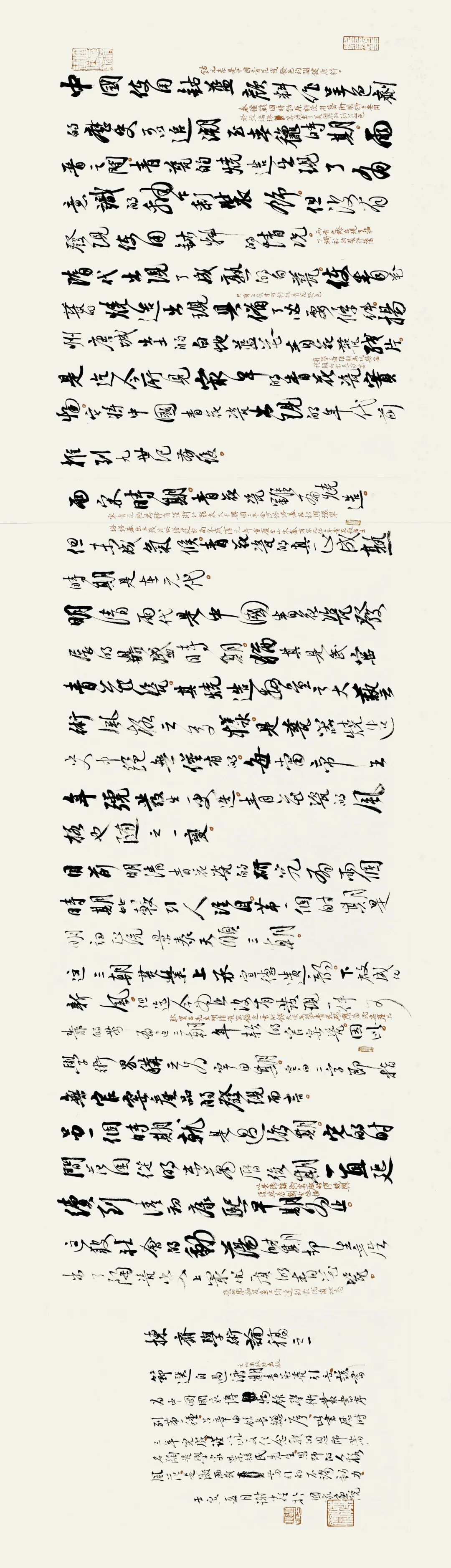 谢小铨长期在文博单位工作,先后在中国历史博物馆、国家文物信息中心和国家博物馆做文博服务、研究和管理工作。从事各门类文物的鉴定、考证、研究,书法也成了他的日课和长时间的修养,所以他的书法是文博界学者的书法。这包括两个方面,一个是他像古代书 家一样,对美观、实用两方面都重视,不是只追求书法的美观,忽略了实用。他把书法美与他从事文博工作的实用结合起来,有的写文物 研究的初稿,有的是对拓片的题跋,有的是笔记,这些是与他文博工作密不可分的,是有实际应用的。另一个是他不仅把书法当作日常应用, 而且也做书法艺术的探索。这就和有些个以书法为职业、以书法为专业的书法家不同。比如,我接触一些西方和日本的书法家,他们对中国书法的认识,就是认为中国书法是一种艺术,这种艺术是可以大胆发挥的,甚至于向抽象艺术发展,他们只写一个字,像抽象画,不是实用的。谢小铨是把书法视为中国文化的表征去传承和发展的。