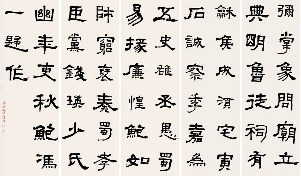 谢小铨的书法传承,在楷书方面,主要是颜真卿,颜真卿的书法堂堂正正、宽博大气,有正大气象。这是谢小铨筑基的因素。他那些大字是深受颜真卿影响的。