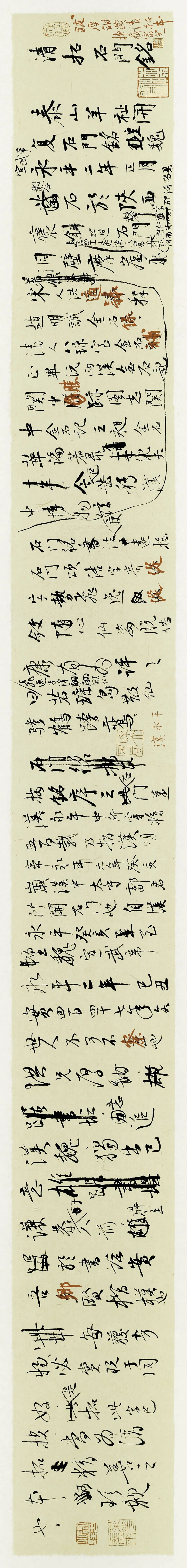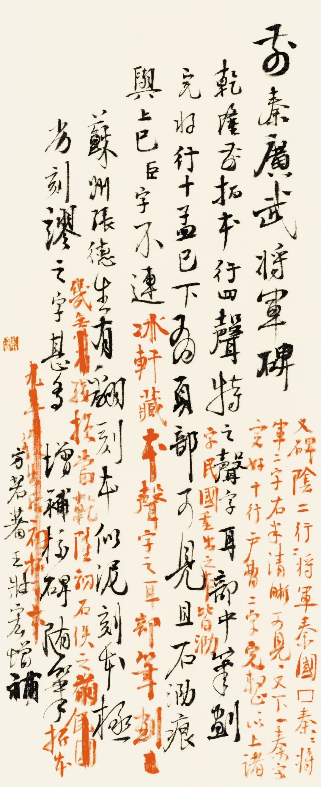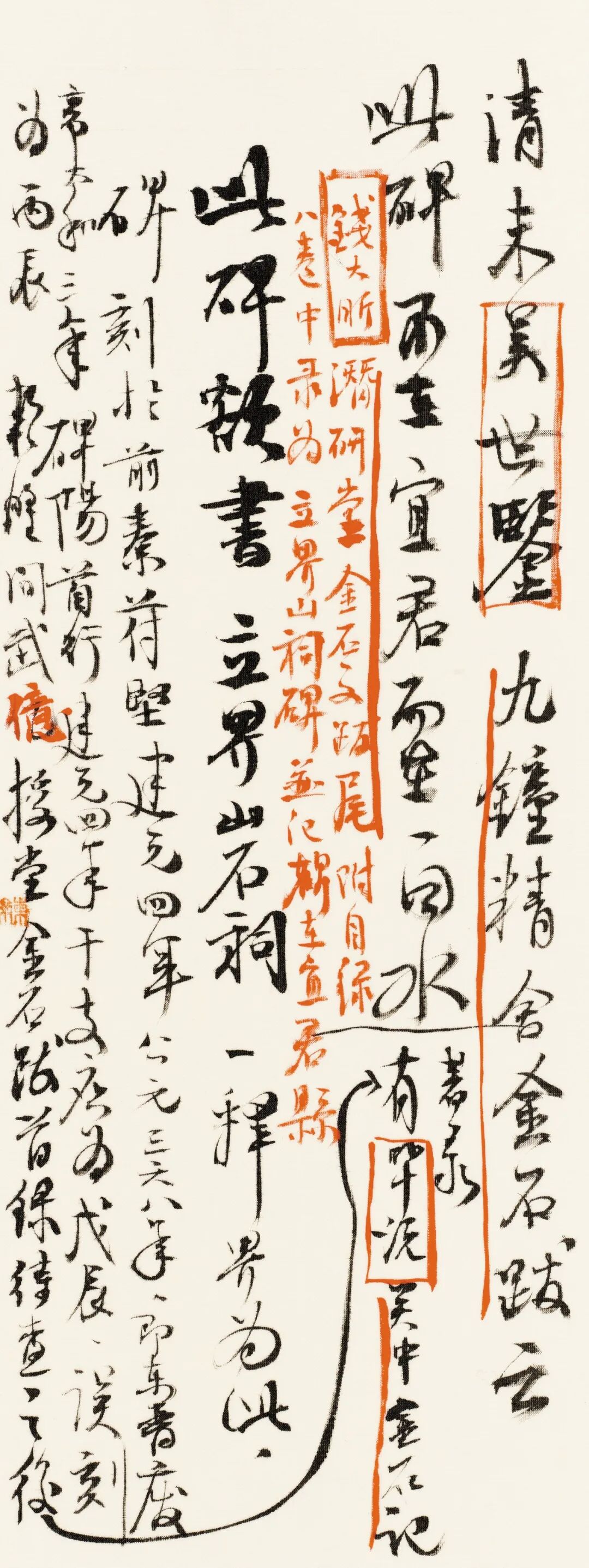 谢小铨还写隶书。他的隶书写得比篆书多,写的是汉隶不是唐隶, 也不是清人的隶书。相对来说,唐隶太老实、规矩,汉隶丰富多彩,谢小铨取法汉隶,不管是《张迁碑》《乙瑛碑》,还是史晨碑。这样的汉隶是有波磔的,有丰富变化的,而且体现了一种金石气,因为是刻出来的,我们看到的原碑或者拓片,经过风化,有历史的痕迹。学颜鲁公是有庙堂气,正大气象。学汉隶增加书法金石气。谢小铨写小字的时候,还有二王的东西。他的书法是用于日常书写的,在他正式对一件东西题跋前,先很随意地写出来作为一个初稿。这种日常书写,又和书卷气有关系,谢小铨的书法向三个结合发展,庙堂气、金石气、书 卷气。小字作为稿子强调书卷气,大字重庙堂气,题跋、隶书有金石气。