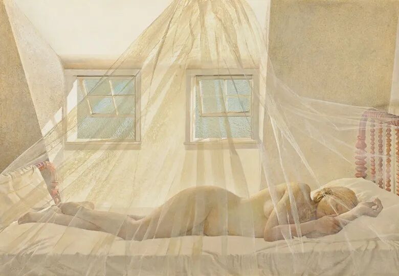 画作的构图撩人,以偷窥的角度展示正在安睡的女子,但她却藏在纱帘之下,若隐若现。怀斯非常擅长描绘女子身边的网状布料如何捕捉光线,使她看上去彷佛即将苏醒的女神。怀斯于1980年在美国缅因州克莱德港的祖屋里创作此画,是他为海尔格·特斯托尔夫 (Helga Testorf) 创作的系列之一。特斯托尔夫是怀斯邻居科纳夫妇 (Kuerners) 所聘请的护士,也是其400多幅作品的主角。若靠近细看窗户的明亮蛋彩和特斯托尔夫身上的光线移动,亮白色和乳白色便展现出无比精细的细节。很明显,除了色彩外,颜料的质感也为整幅构图增添微妙的光感。这些来自保罗·艾伦珍藏的作品均为巧妙运用光线的杰作,各位艺术家开创出独特的方式,展现光线最迷人的魅力。他们分别塑造出一种难以捉摸的氛围,但又能唤起清晰独特、却又难以言喻的感受。他们了解氛围,更了解人类如何回应不断变化的自然环境。
