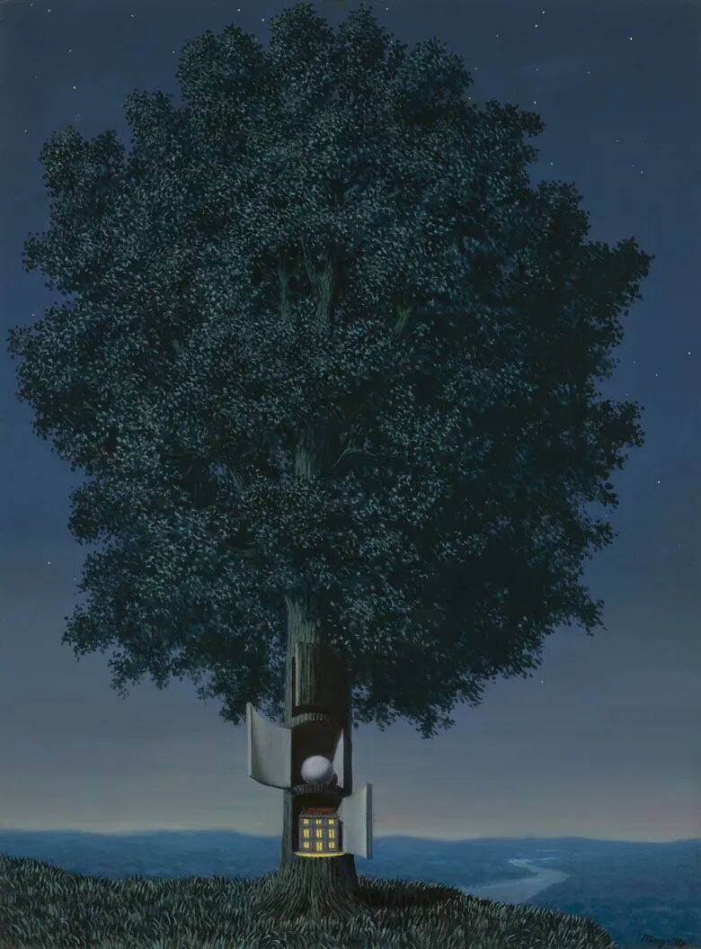这幅超现实风景画的标题可以翻译为“血会证明一切”,又或直译为“血声”,作品同时借鉴了路易斯·卡罗 (Lewis Carrol) 著作《爱丽斯梦游仙境》的元素——爱丽斯穿过树洞,以及马格利特对奇幻事物的兴趣。他在多篇文章里谈及作品标题时表示︰“血液所支配的言语,对我们来说有时很神秘。在这里,我们彷佛被命令打开树上的魔法树洞。”这棵像柜子般的大树位于山丘边缘,山下是一望无际的景色。树干里有一间小屋,上方的洞里则有一个球体。值得留意的是,顶部的柜门微微打开,无法得知里面藏着什么。马格利特避免使用明确的象征意义——屋子代表“x”,球体代表“y”,而是通过改变现成物品的用途,以塑造另一种感觉。屋里散发的柔和光线,暗示我们可能唯有身处暗藏秘密的世界里,才能真正感到自在。若要了解一切,便代表没有新事物可以发掘。因此,那扇半开的门代表隐藏、未知与家的感觉之间的张力。画中的光线穿透黑暗,仅为观赏者提供少许信息,其余则留给我们自行解读。另一方面,以阴影衬托光线来揭示主题,也能产生同样深刻的效果。马克思菲尔德·派黎思创作的《山顶》(Hilltop)一作,巧妙地描绘出光与影之间的关系。他希望作品能有自己的声音,并表示︰“我认为,如果画作无法诉说自己的故事,那宁愿有故事而没有图画。画作说明一切,除此之外再无其他。”