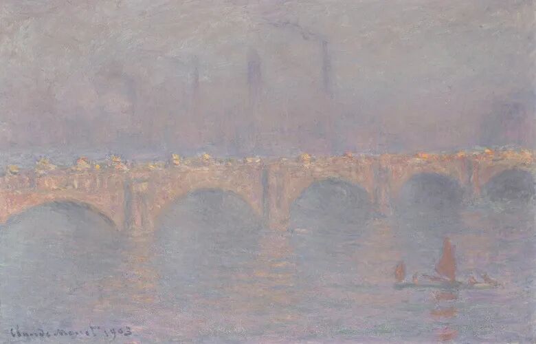 莫奈在阳台上为这两座大桥绘画的大量作品,记录了一天中阳光照射在水面上的光影变化。在《滑铁卢桥,彩云遮日》(Waterloo Bridge, soleil voilé) 里,他对景色的描绘更是登峰造极。他把包括大桥和背后工厂那冰冷的城市景色,变成画布上一片和谐的色彩,凸显伦敦的浓雾如幽灵般笼罩着这座永不止息的城市,为景色添上一股安然宁静的气息。