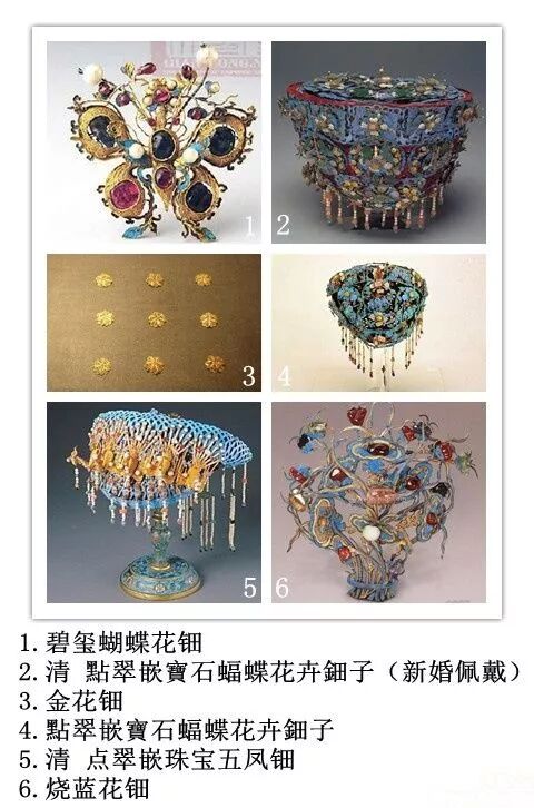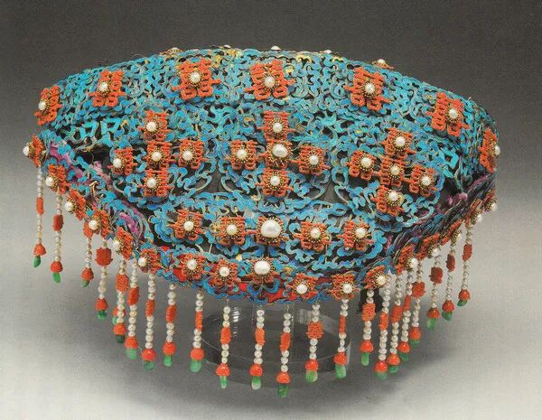 举个例子:见钿花图2这是结婚时新妇所戴的冠帽。在金属帽胎上,罩复着黑缎为里的空花红绒面,其上再满缝层层叠叠的点翠嵌珍珠、珊瑚、宝石的钿花:沿着顶沿附着的是一圈点翠囍字,其上再叠着七个方形花卉蝙蝠纹钿花;额面的圆形和长条形钿花则以花卉蝴蝶为主纹;顶面的钿花作如大花篮,满盛各样花卉;两侧及额首缀有珍珠流苏,每串贯珊瑚囍字与翠玉或碧玺坠角。整顶冠帽以大红色的绒底子和艳蓝色泽的翠羽为主色,以及满嵌高低错落的珊瑚、珍珠、翠玉、宝石的各色装饰;而醒目的囍字周绕冠帽,还摇荡垂在额前。清宫皇后大婚物品清单中便列有相似满簪缀饰的钿子。