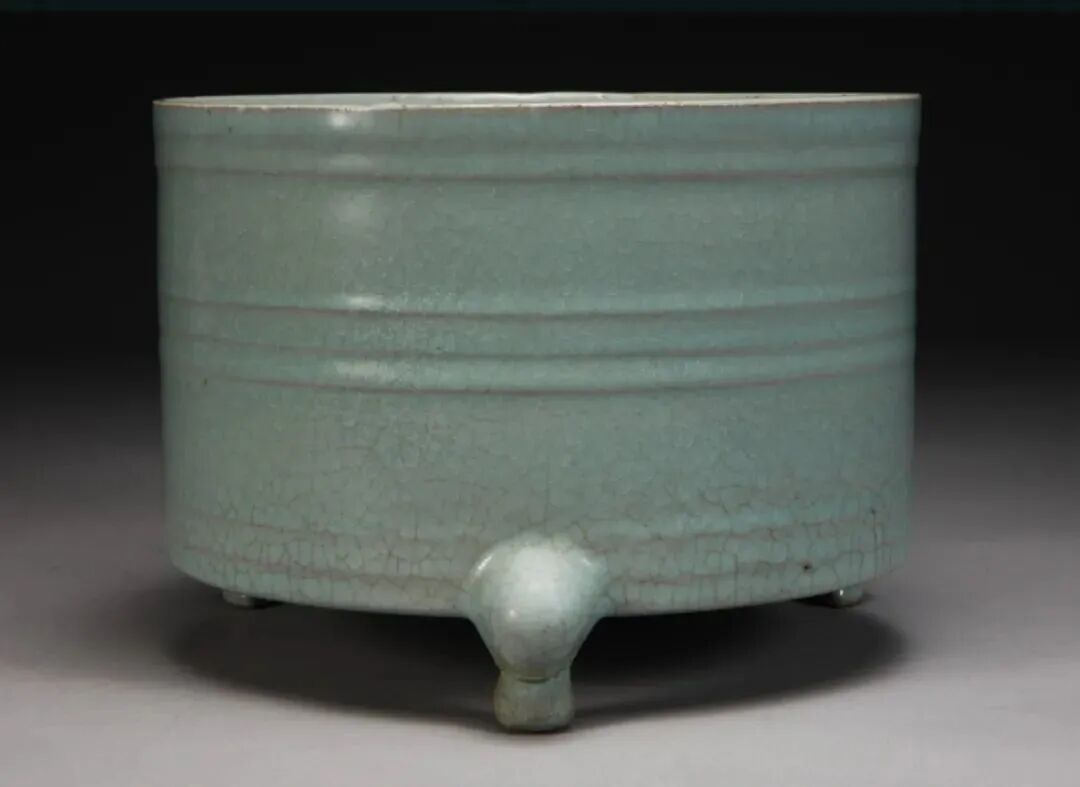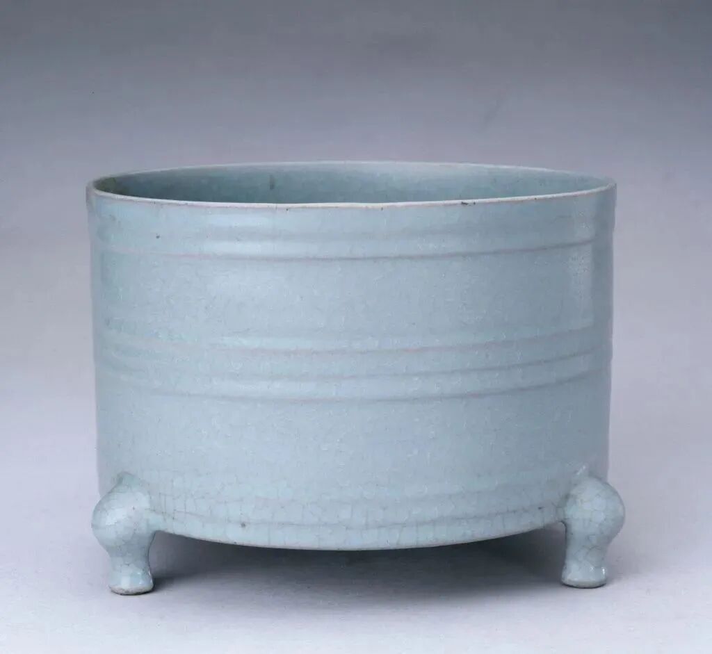 宋 汝窑淡天青釉弦纹三足樽式炉