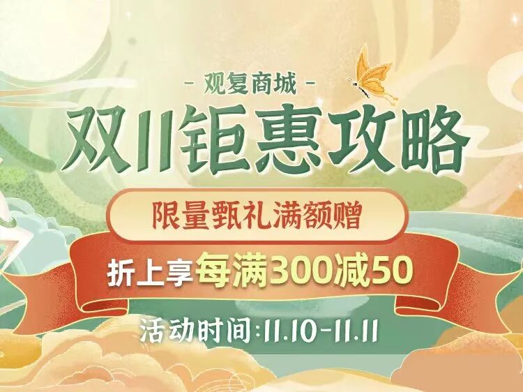双十一钜惠乐享不停。直降、满减、好礼、折上再享每满300减50,满额即赠限量甄礼!