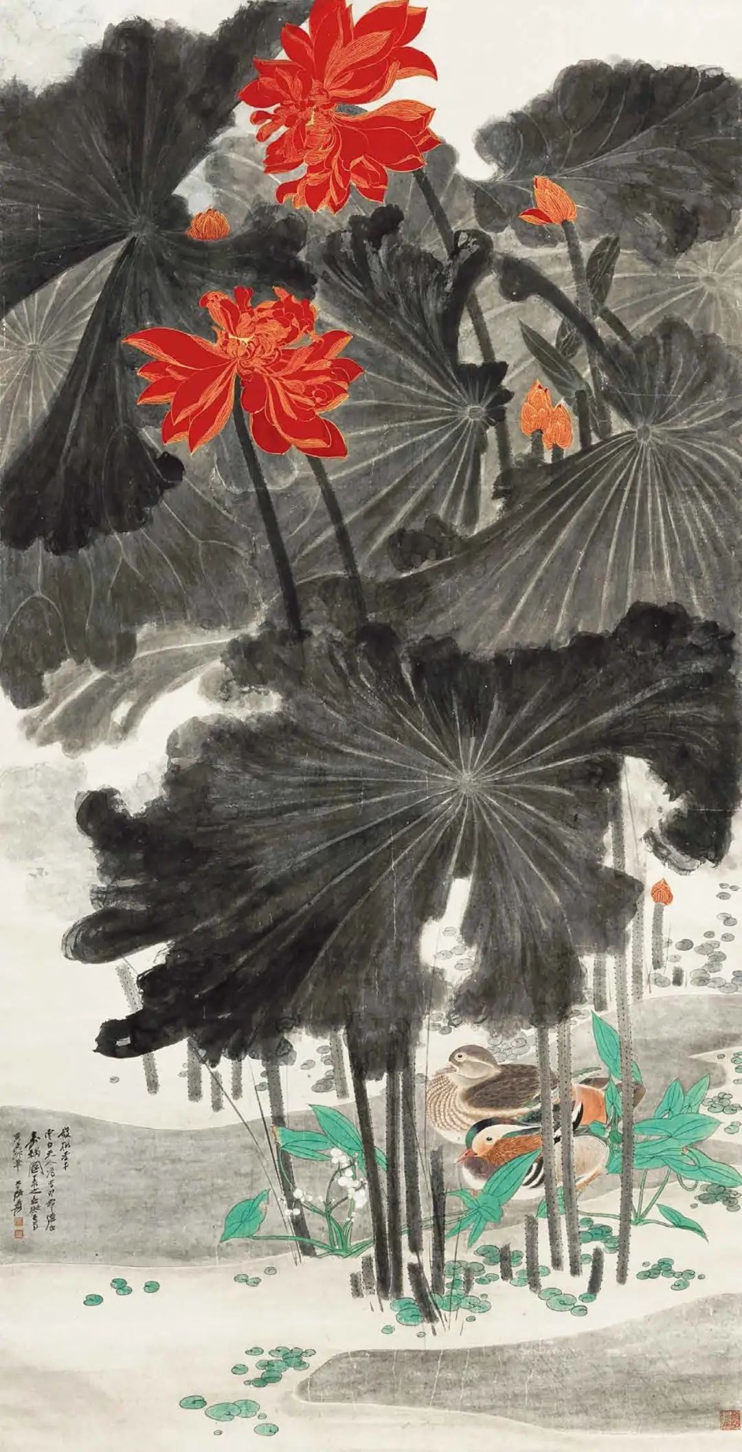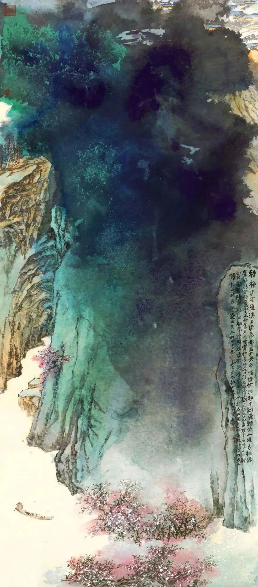 我对西洋画没有研究,不是不喜欢它们不去研究,我觉得一个人的精力是有限的,我们自己国家固有的东西,我们都还研究不完,所以我就没有精神去学西洋画,但是我对于别的国家的画,但相尊重不相思,我很尊重他们的,可我没学过,就我个人的理想,就是这普通一般的可以分这是东方的画,这是西方的画,我想到了最高的境界,没有分别。所谓这个普通的分别是什么呢,风俗习惯不同、用的工具不同,所以画出的画不一样,这是西洋画,这是中国画。我想最高的时候,用油画的方法一样可以画中国画,那么用毛笔、用胶水、墨水一样的可以画西洋画,所以我看到外国的画,我们虽然没研究……我觉得他们出发点用意、用心也是一样的,在我个人的想法,不必要严格去分东西之分,到了最高的境界是一样的。抽象画,不是现在才有的,在我们中国最早就有,我们中国讲书画同源,写字跟画画是一样的。殷墟出来的甲骨文的字,比如马羊虎狗日月龙,都是画,就是现在的抽象画,所以抽象就是把这些没有用的东西不要了,取它的精华,所以抽象画中国最早。从前铸九鼎,它上面就有这些奇奇怪怪的图在上边,现在我们是看不见的,但是我们就拿殷墟的这个字来看,知道这个画就是抽象的。到了战国时候春秋时候老子的学说,他所讲的都是抽象画的道理,他说“以貌取胜”,普通的面貌不要,就只有抽象。他又说“无相之相”,没有相当中有相,所以没有相这个东西有他的精神在,这也是抽象。他还有两句话说得最明白,他说“得其环中,超以象外”,我们先在这个圈圈里面做功夫,最后跳出圈子就好了,那就是抽象。我常说,画有三美:曰大,曰亮,曰曲。这是什么意思呢?所谓“大”者,指的不光是画的尺寸和篇幅大,而是角度要大,要开阔。就是一张小画,也要能从小中见大,虽小景而有大气势、大寄托。所谓“亮”者,是指一幅画能给在众人的作品中最为突出和醒目,让人一眼见到,就能为它所吸引,所震撼,这就是“亮”了。所谓“曲”者,就是画里面有股曲折不尽的意思,让人不能一眼看穿,而是感到余音袅袅,回味无穷,这便是“曲”了。曲的要求是很高的,因为它不仅求之于画面,还求之于画意和画境。这正如宋人郭河阳论画,说山水画最好的境界,便是可以观,可以游,和可以居了。一幅画若能如此,无疑便已臻上乘。我们作画不仅要往“大、亮、曲”上努力;就是赏画,也可借用这个标准。学不通经,谓之俗学,书不通篆,谓之俗书,画不抚古,为之俗画。作画如欲脱俗气、洗浮气、除匠气,第一是读书,第二是多读书,第三是须有系统有选择地读书。古人所谓“读万卷书,行万里路”,这是什么意思呢?因为见闻广博,要从实际观察得来,不只单靠书本,两者要相辅而行。名山大川,熟于胸中,胸中有了丘壑,下笔自然有所依据,要经历的多才有所获。山川如此,其他花卉、人物、禽兽都是一样的。谈到真美,当然不单指物的形态,是要悟到物的神韵。这可引证王摩诘两句话,“画中有诗,诗中有画”。“画是无声的诗,诗是有声的画”,怎样能达到这个境界呢? 就是说要意在笔先,心灵一触,就能跟着笔墨表露在纸上。所以说“形成于未画之先”,“神留于既画之后”。![]()