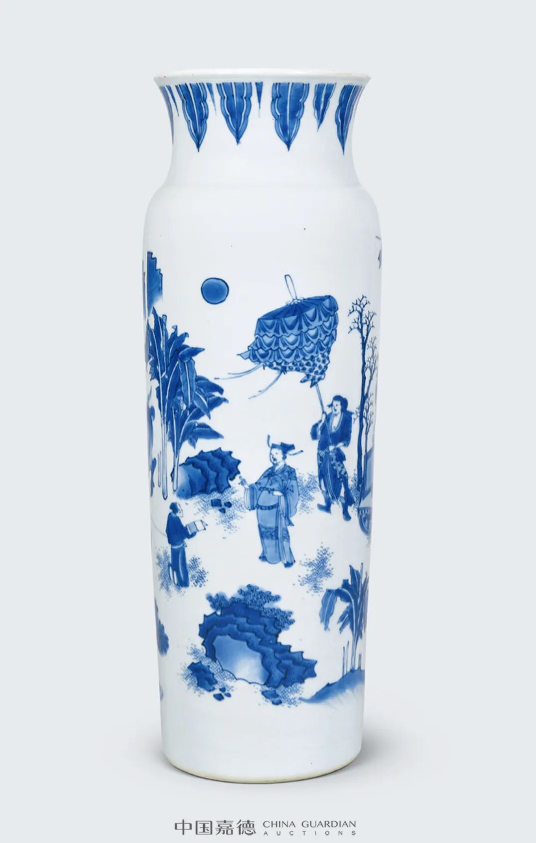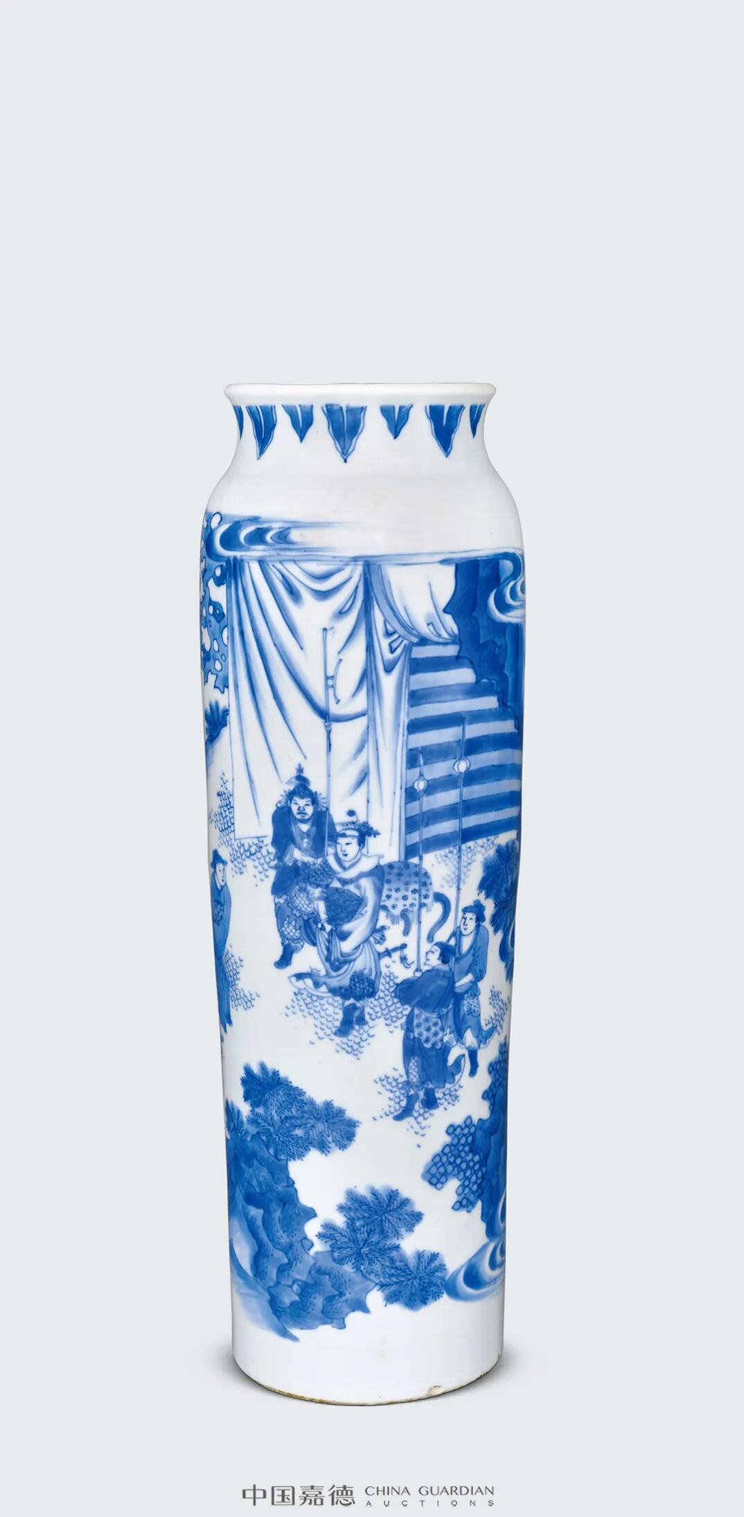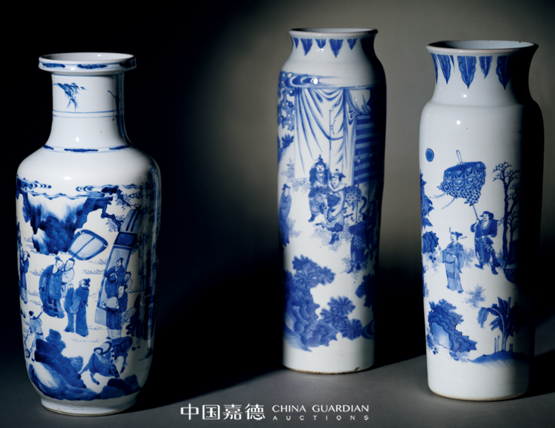 “加官进爵”的瓷绘题材,是明末清初时期较为典型和常见的吉祥纹饰,旨在鼓励读书人积极入世,是明末读书人心态的一种反映。而且通常以“粱冠”和“爵杯”来指代加官进爵之意思。本品即为此类题材之典型,其体量硕大,器形端庄挺拔,青花发色极佳,为明代崇祯时期同类器物中的佼佼者,颇为贴合明末宋应星《天工开物.陶埏》中所云之“上品细料器”之特征,颇值珍视。