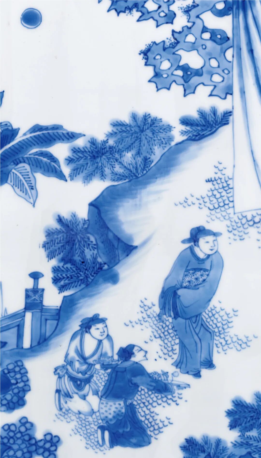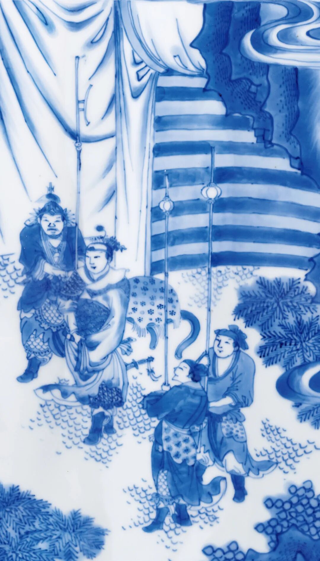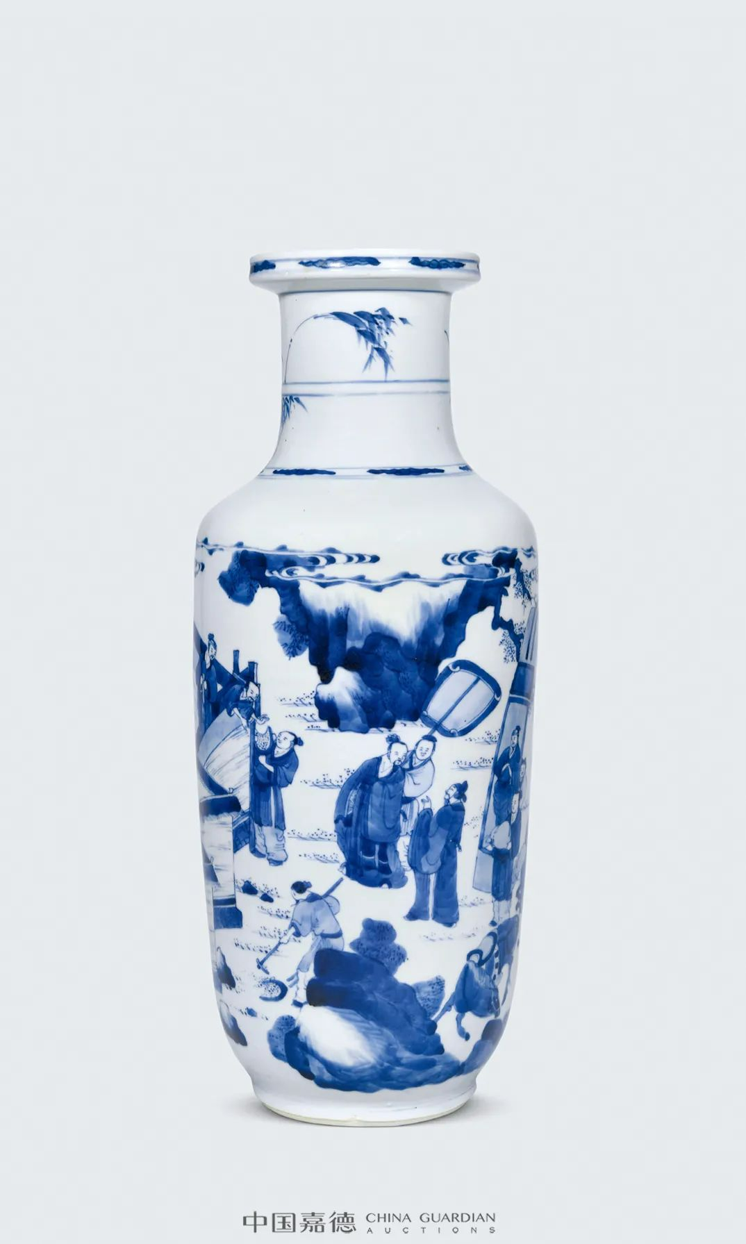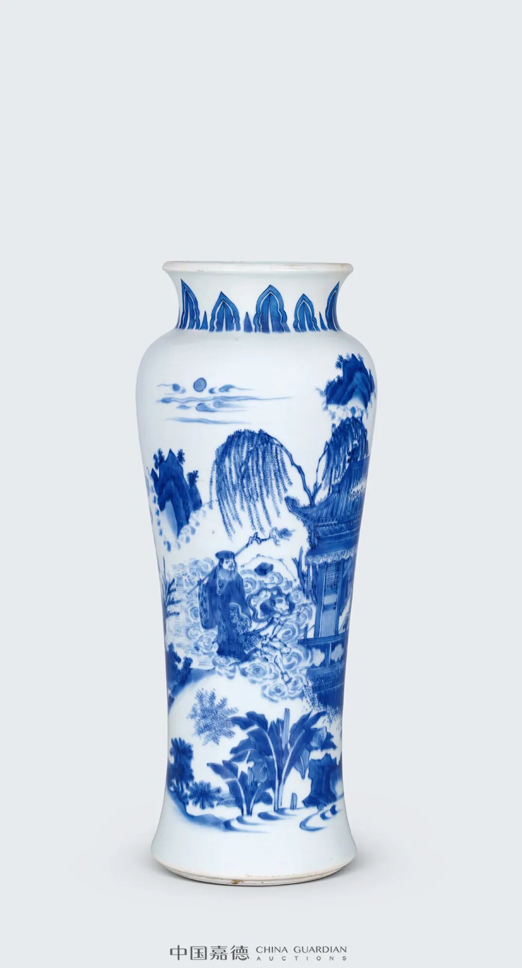 本品则对远山近水,高台楼阁,山峦的阴阳反侧,树木的疏密错落,人物的多种姿态的描绘可谓出神入化,体现了康熙山水人物瓷绘的登峰造极的艺术水准。本品挺拔俊秀,通体青花装饰,鲜丽明快,层次分明。画面构图繁复,笔法灵活,绘画细致,富有立体感,山石采用康熙流行的分水画法绘成,浓淡相宜,仿佛一幅水墨画在瓷器上挥洒而就,极富观赏性和收藏价值。