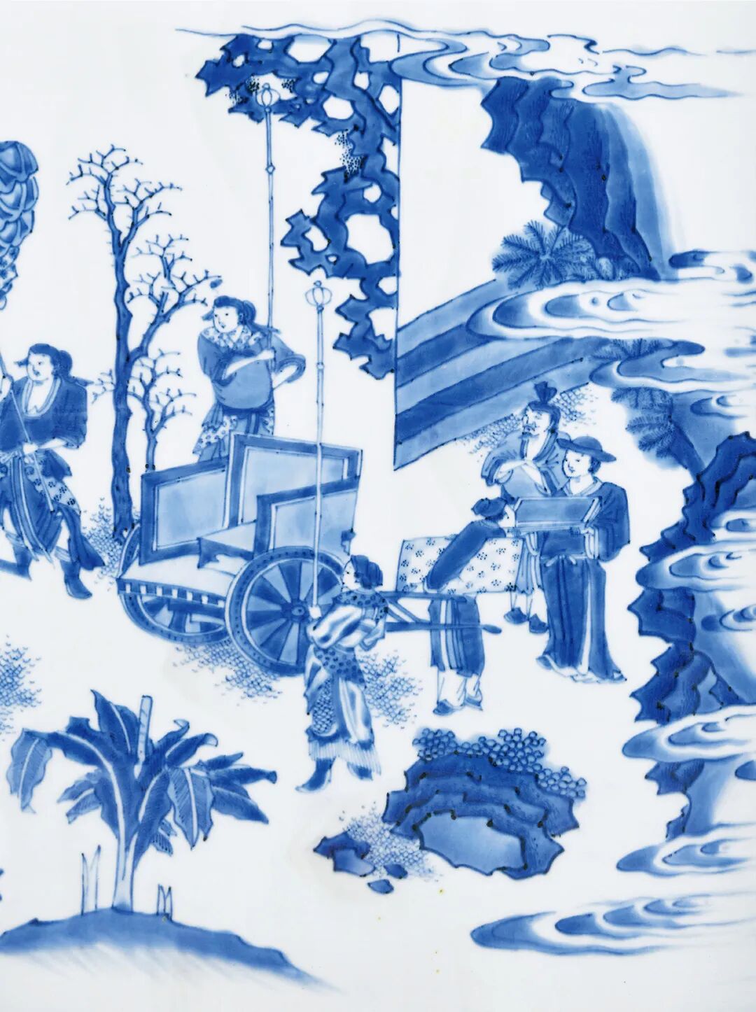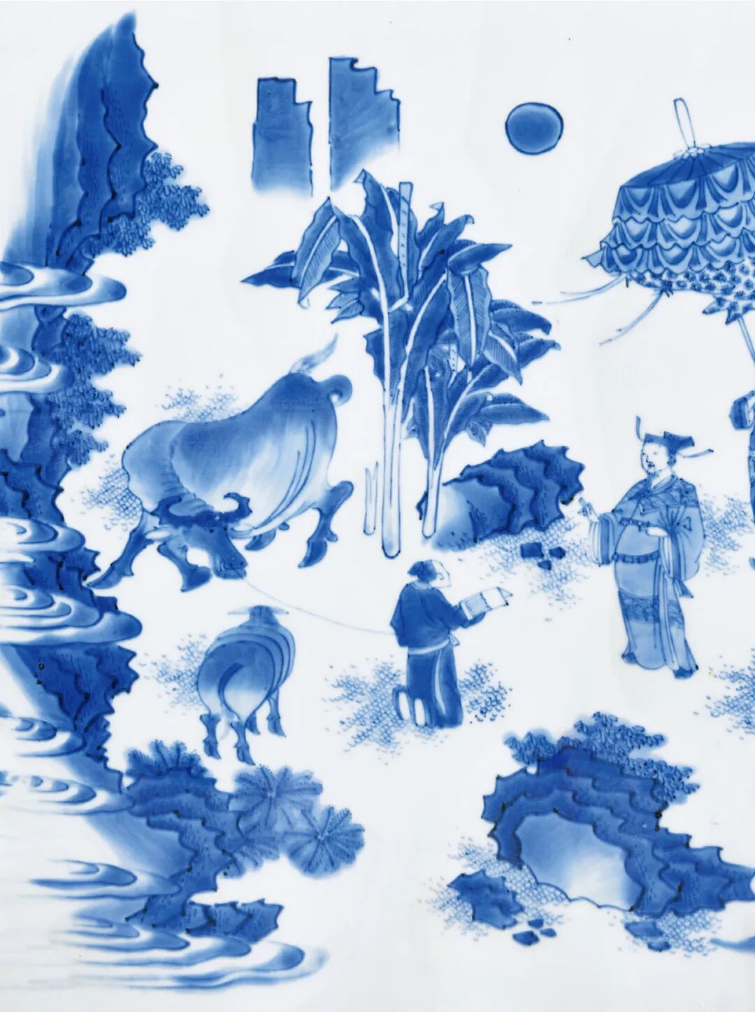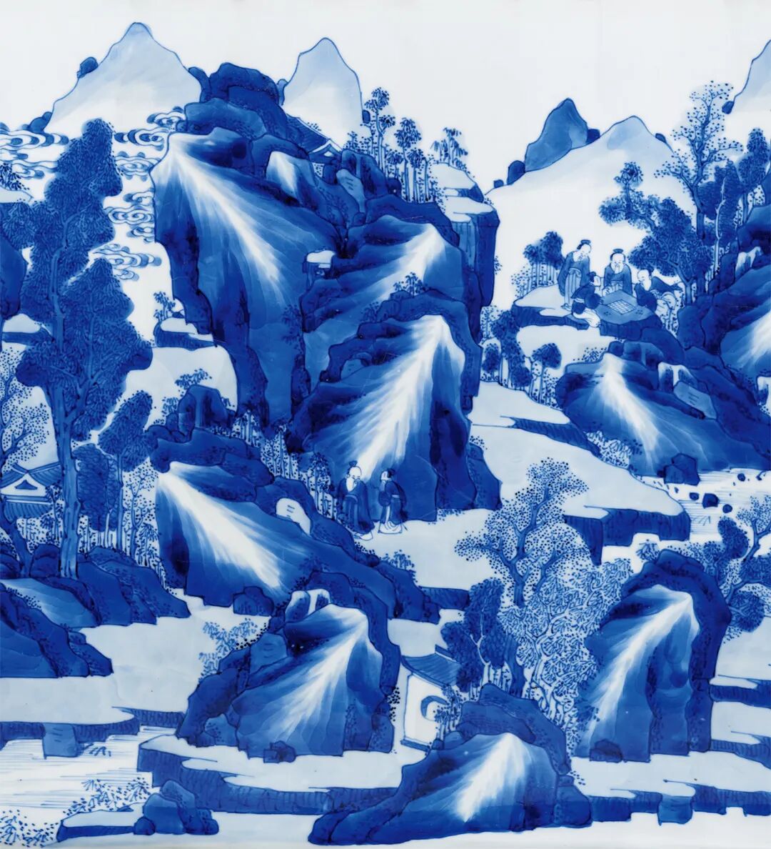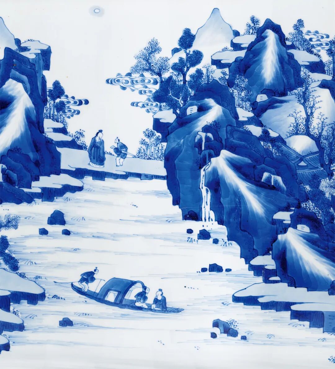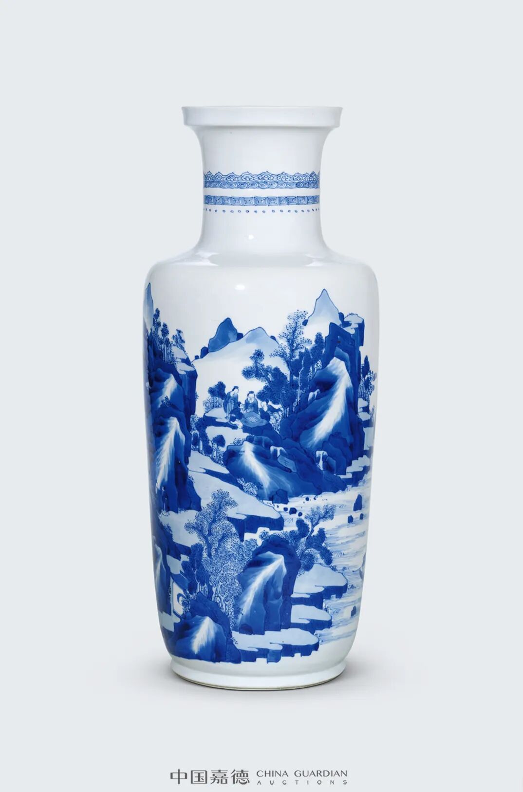 本品则对远山近水,高台楼阁,山峦的阴阳反侧,树木的疏密错落,人物的多种姿态的描绘可谓出神入化,体现了康熙山水人物瓷绘的登峰造极的艺术水准。本品挺拔俊秀,通体青花装饰,鲜丽明快,层次分明。画面构图繁复,笔法灵活,绘画细致,富有立体感,山石采用康熙流行的分水画法绘成,浓淡相宜,仿佛一幅水墨画在瓷器上挥洒而就,极富观赏性和收藏价值。
