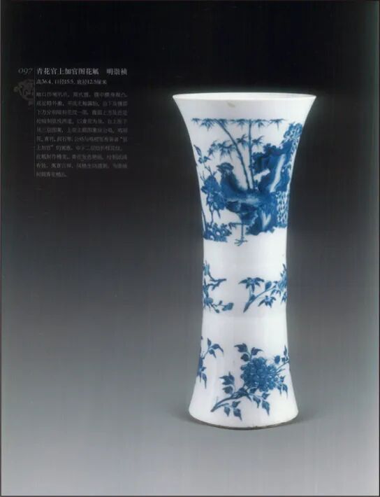 本品造型隽秀,端庄大方,线条流畅,器身装饰时代特征明显。此种器型的花觚为崇祯时期新创,无论器型还是三段式的纹饰装饰,均影响了此后顺治、康熙时期花觚的烧造。