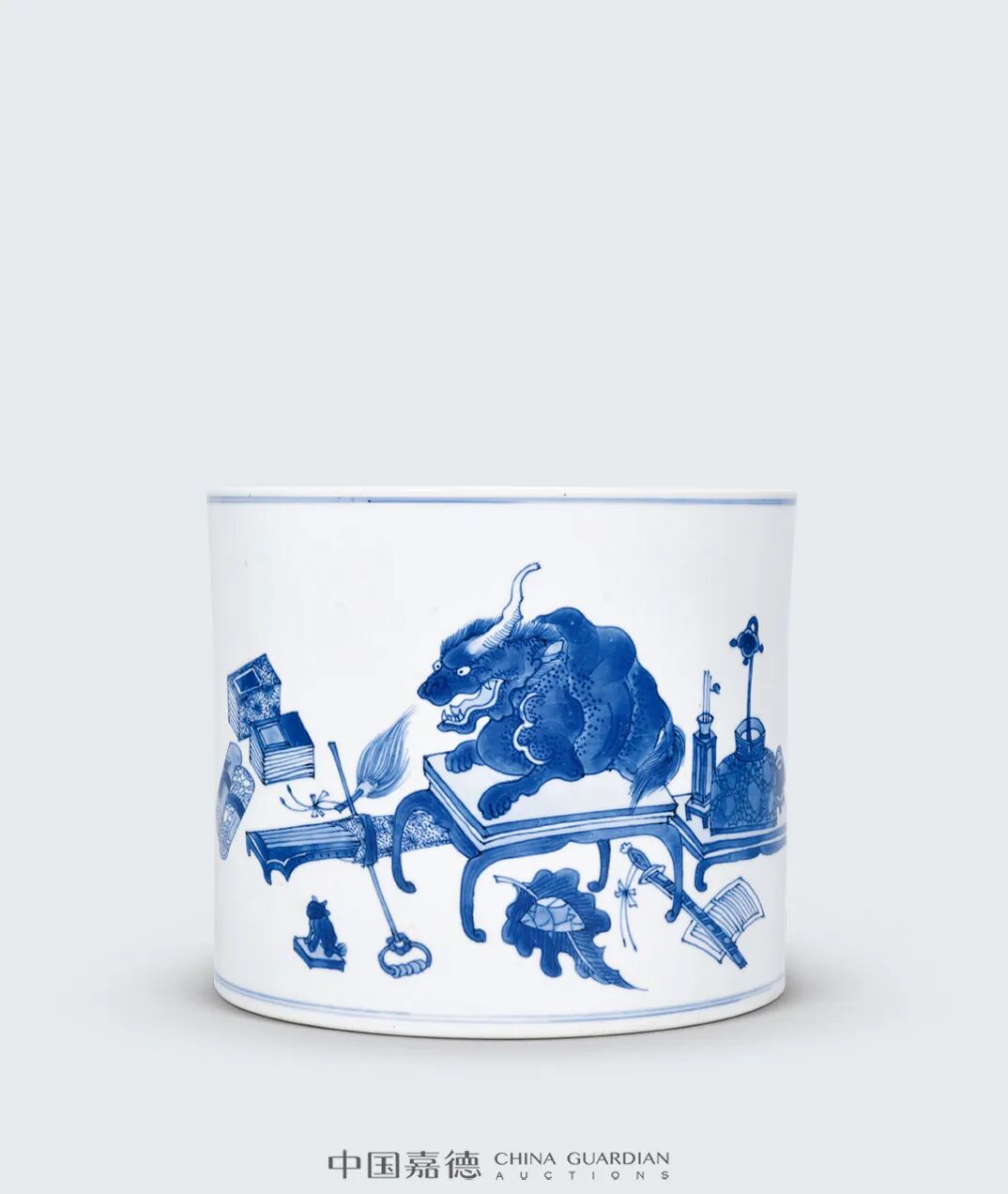 此笔筒结合博古图与渔家乐图,另在博古图中填绘瑞兽,三者皆为康熙时期经典瓷器装饰,三者搭配,既有丰富的生活情趣,不乏文人气息,更平添瑞意,为文人雅士案头陈设佳品。本品青花发色淡雅,纹饰描绘细腻,实为同类器之上品。