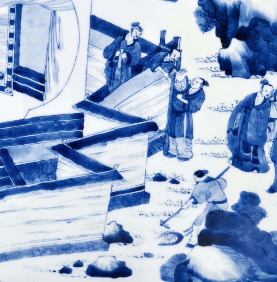 本品腹部青花通景绘“武丁梦相”人物故事图。画面中武丁立于傅说画像前,仔细打量和对比着画像中和立于版筑间的傅说,形态极为生动。“武丁梦相”人物故事是中国古代著名的访贤故事题材之一,源出司马迁《史记·殷本纪》。