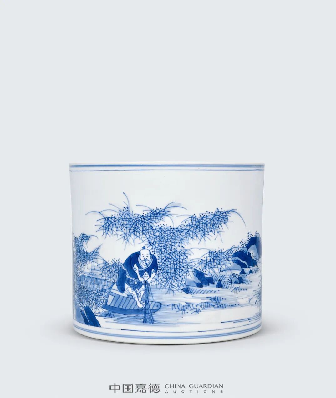 清康熙青花博古开光渔人图大笔筒