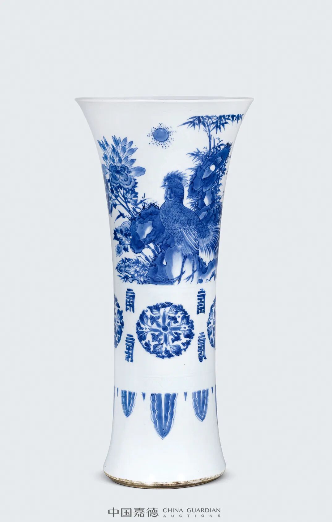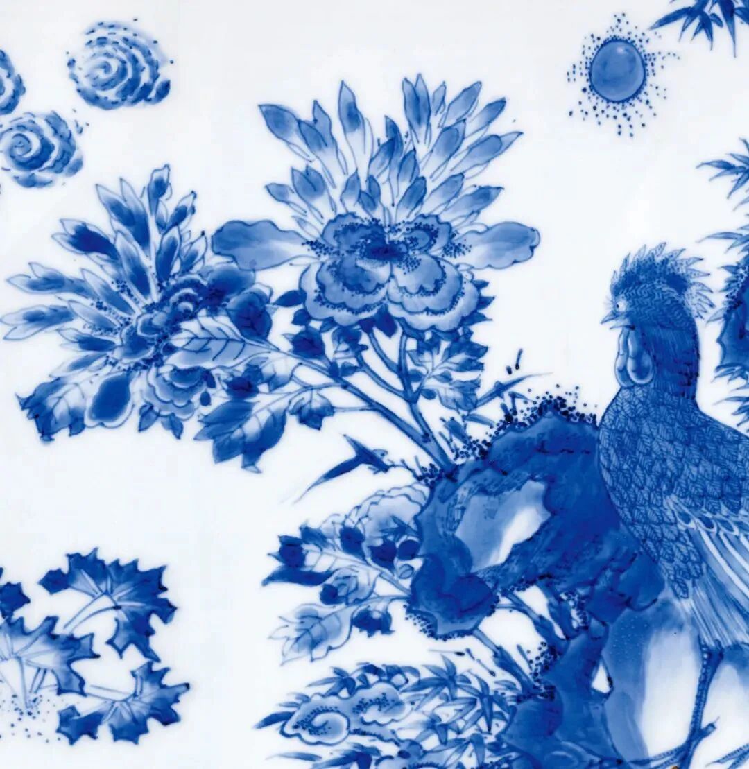 本品质凝细滑,釉润光洁,绘画精细娴熟,青花发色明快,堪称明末青花器的翘楚之作。尤其其雄鸡绘法,尤为独特,鸡冠如锯齿,身羽极其细腻,将每一片羽毛的细节描绘得极为具象,这在此时期是较为少见的。天津博物馆藏有一件崇祯花觚,器型、纹饰均与本品相类,可资比较。