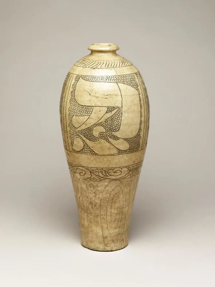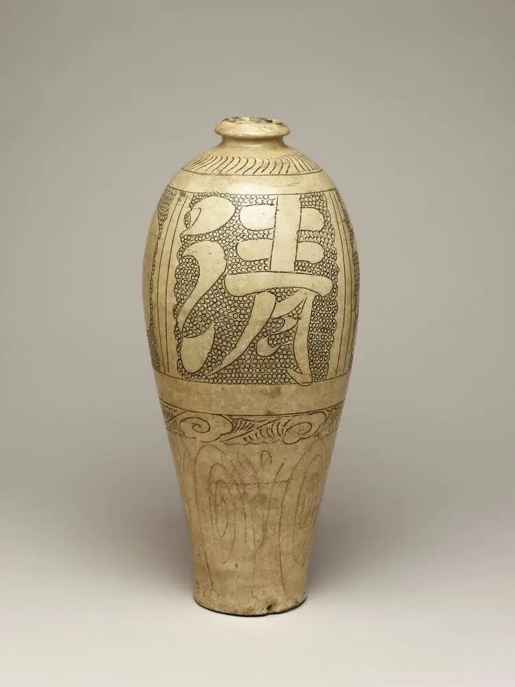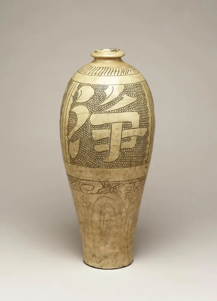 北宋 磁州窑珍珠地「清净忍」梅瓶 大英博物馆藏尺寸:高375厘米该瓶整体端庄挺拔,线条流畅,亭亭玉立。主题纹饰为“清、静、忍”三个字,纹间戳印密集的小圆圈,俗称“珍珠地”。![]()
