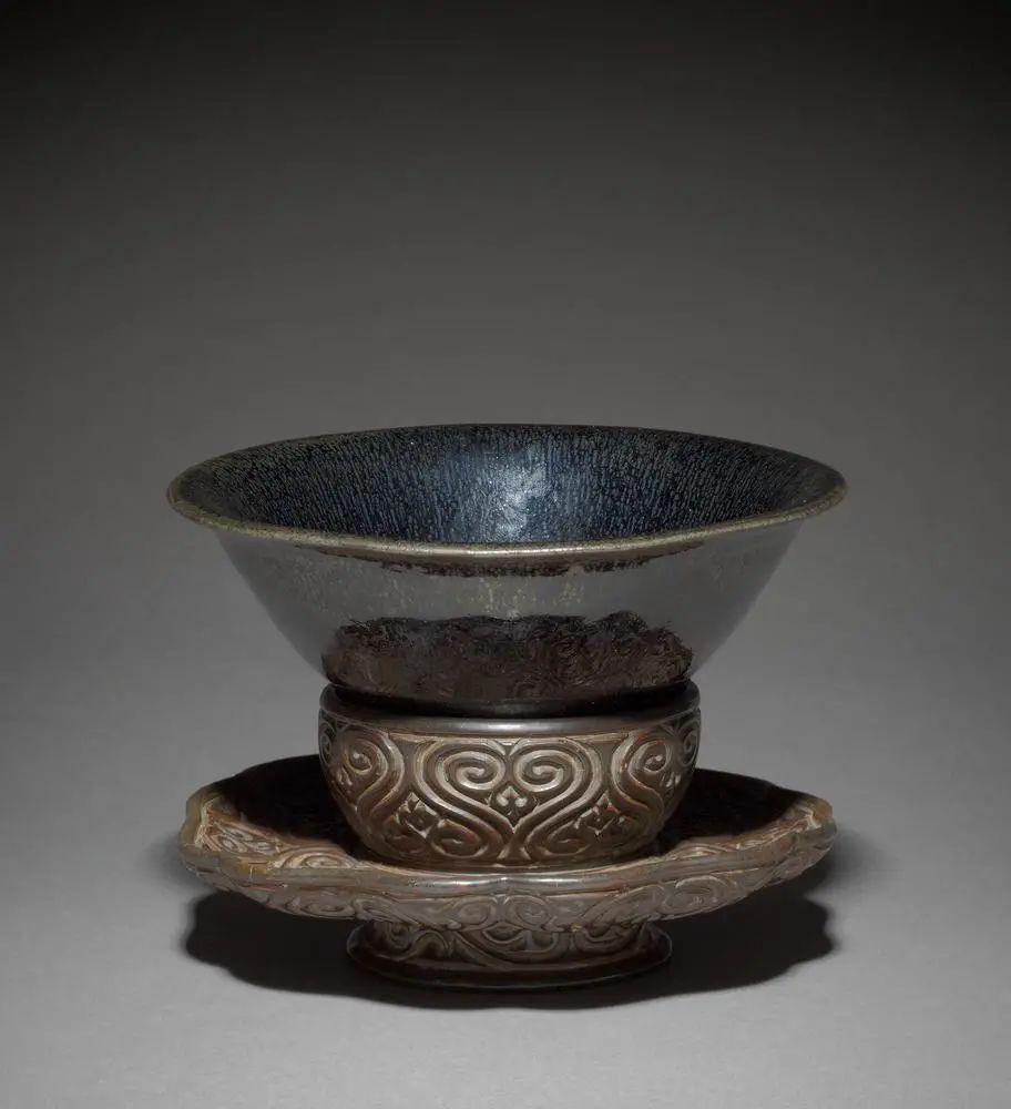 南宋 建窑兔毫盏 大英博物馆藏 尺寸:高65厘米,口径16.5厘米1937年购自 George Eumorfopoulos(1863-1939,东方艺术品收藏家,东方陶瓷学会创始人,因经济萧条将部分藏品售予大英博物馆)。大英博物馆将该盏与剔犀盏托相配留影,符合茶具图赞中,盏最上为兔毫,托最上为剔犀的记载。![]()