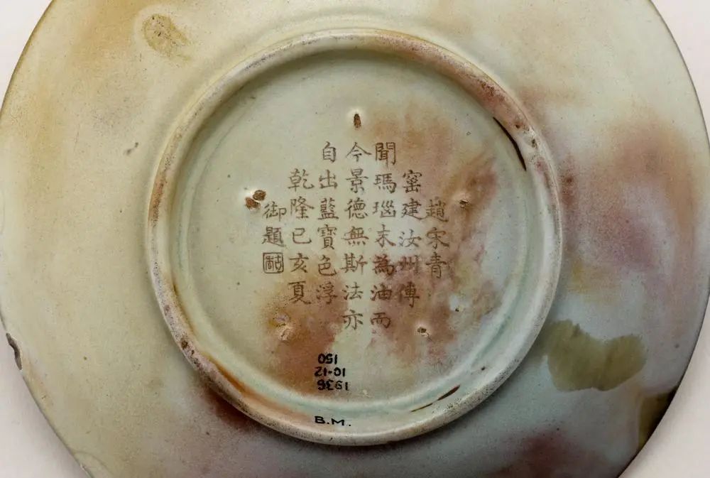 该件汝窑盘火烧痕迹明显,底有乾隆御制诗,“趙宋青窑建汝州傳 聞瑪瑙末為油 而今景德無斯法 亦自出藍寳色浮 乾隆己亥夏禦題 ”![]()