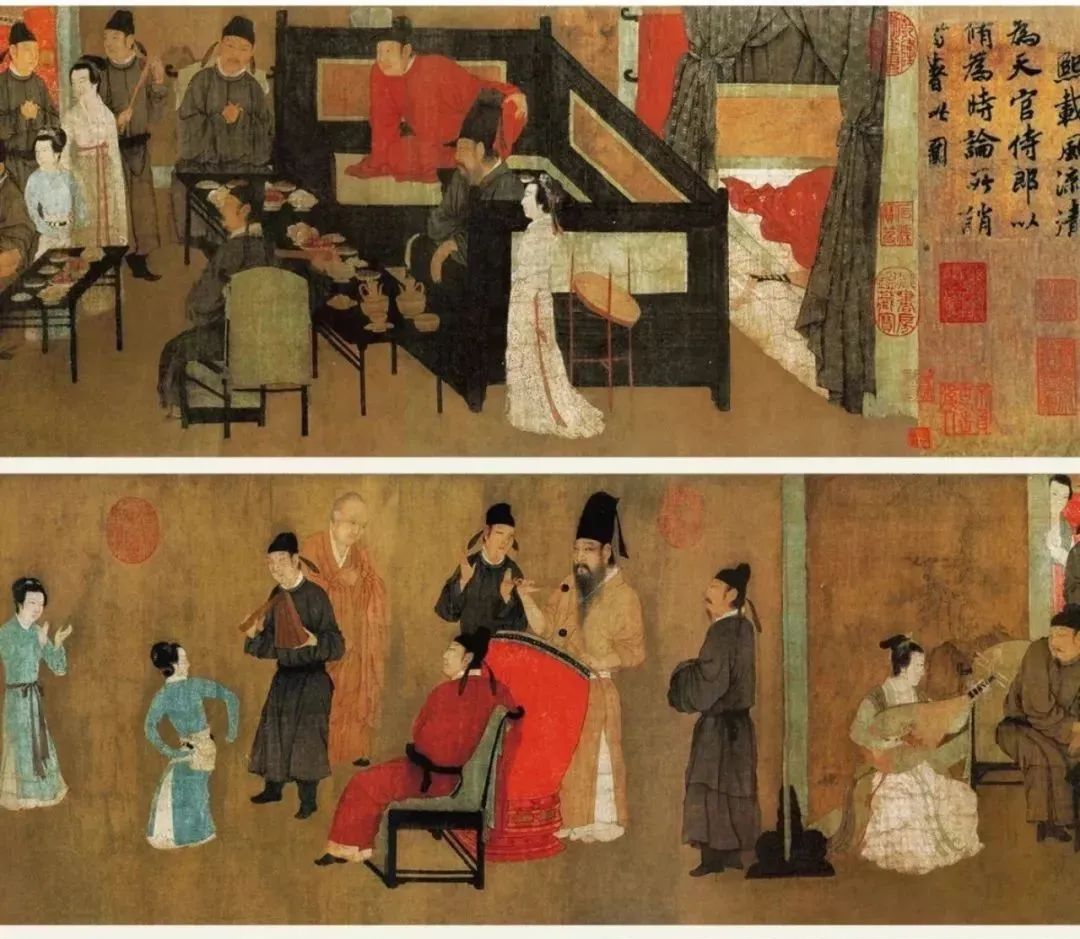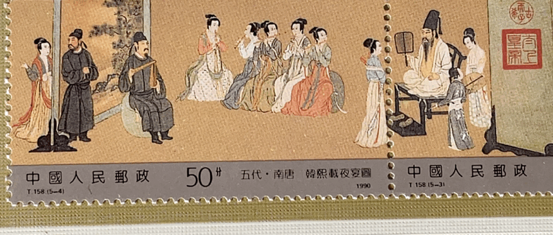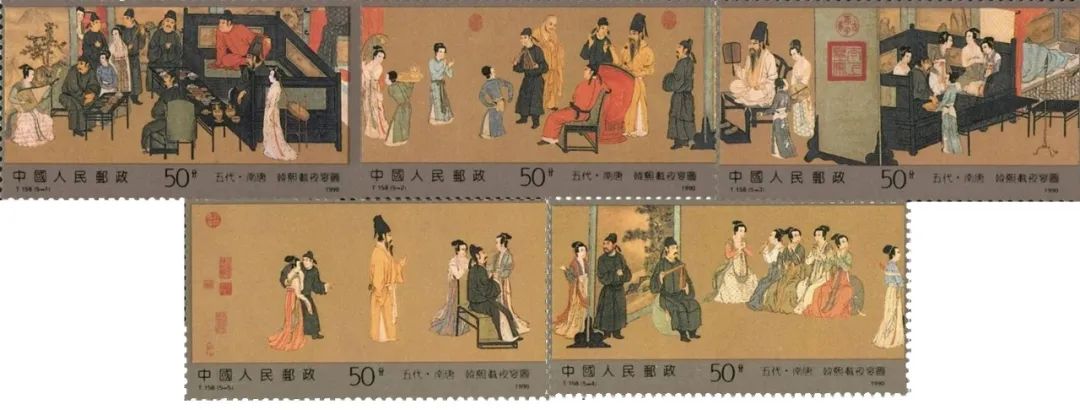 《韩熙载夜宴图》是顾闳中的绘画作品,邮票完整展现了原作内容,记录的便是一次完整的韩府夜宴过程,即琵琶演奏、观舞、宴间休息、清吹、欢送宾客五段场景。