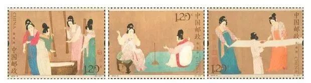 《捣练图》邮票图案描绘了唐代妇女在捣练、织线、熨烫、缝制等劳作时的情景,长卷式的画面上共刻画了十二个人物形象,细节富有情趣,描绘内容很有生活气息。