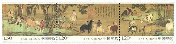《神骏图》为国家一级文物,邮票展现了《世说新语》中支遁爱马的故事:东晋僧人支遁好养马而不乘,有人讥笑他,他却说:“贫僧爱其神骏。”
