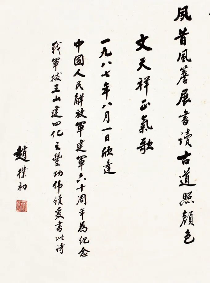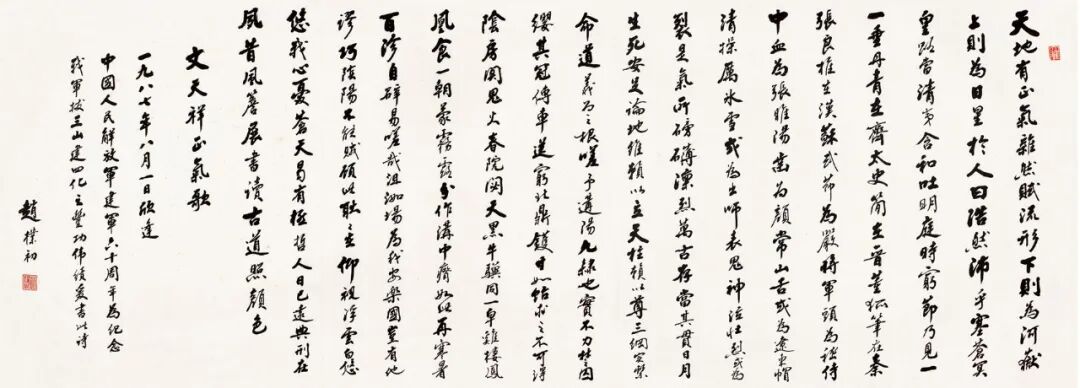 题识:文天祥正气歌,一九八七年八月一日欣逢中国人民解放军六十周年,为纪念我军拔三山建四化之丰功伟绩,爰书此诗。赵朴初。