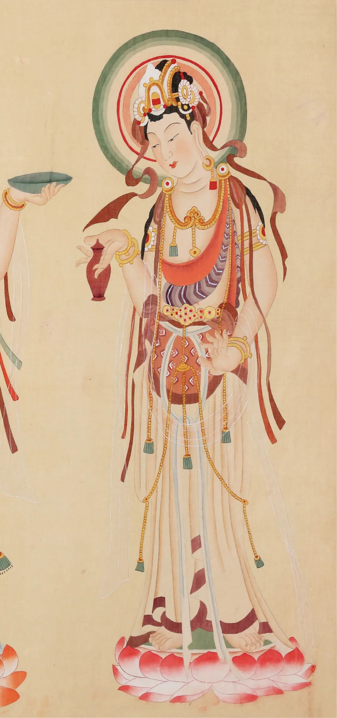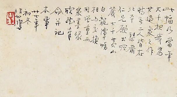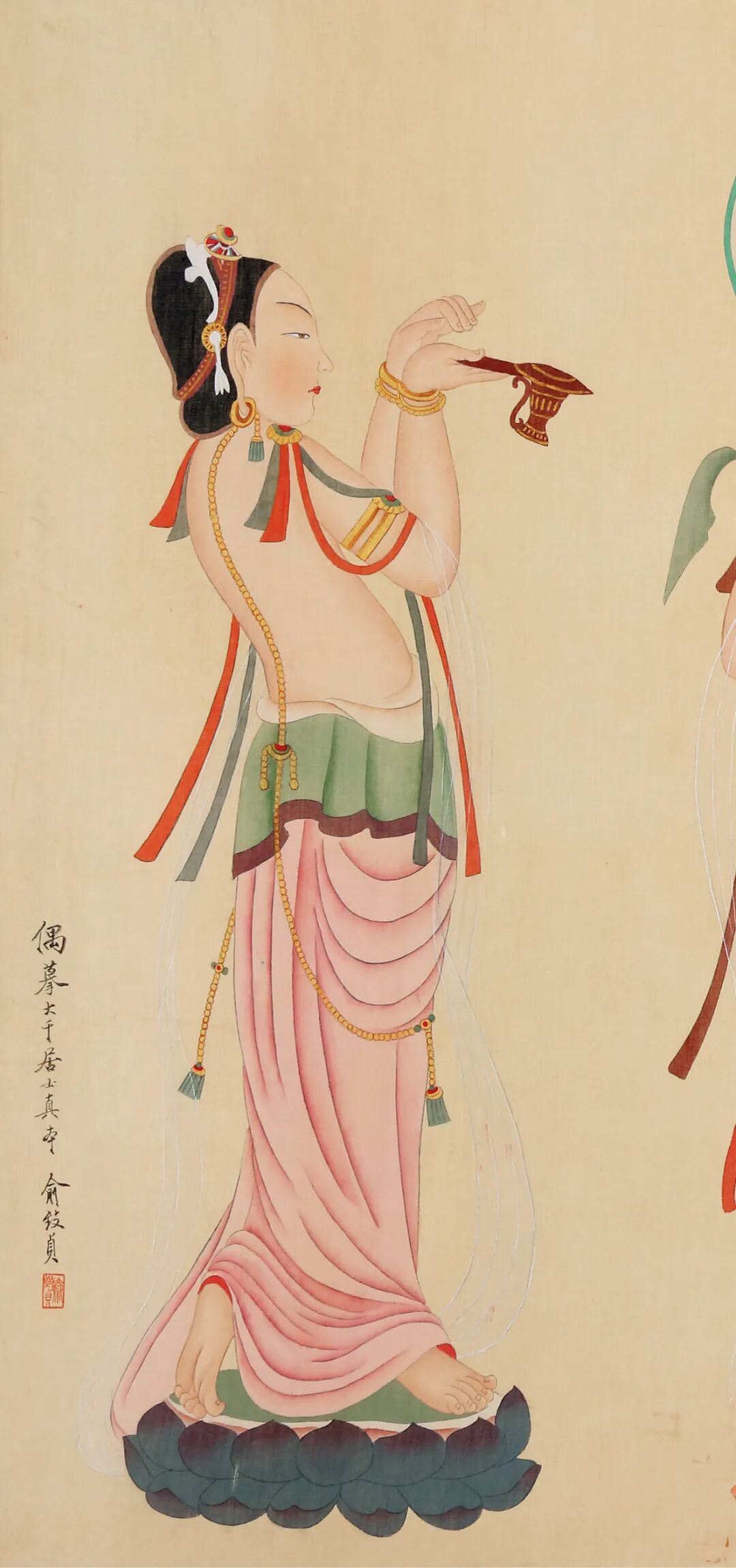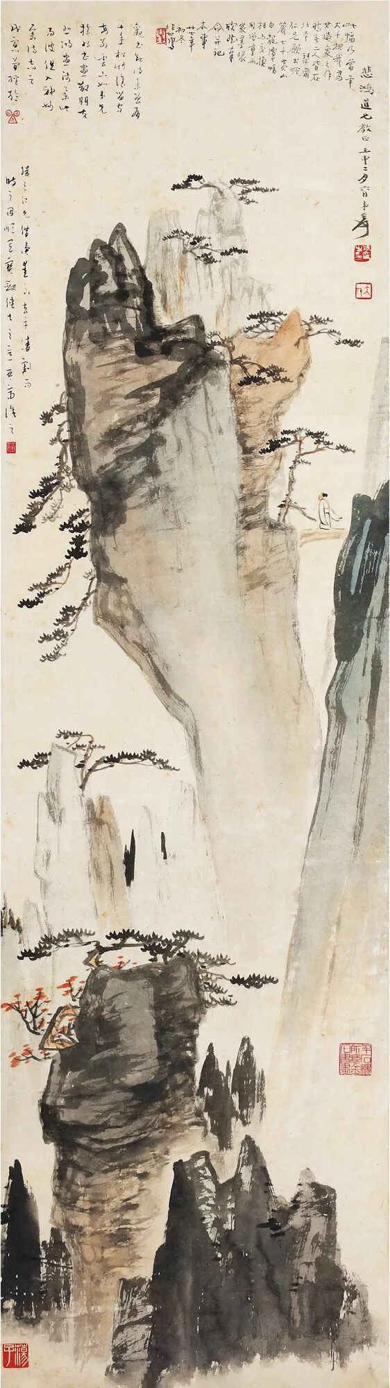 1.此幅乃当年大千报我为其造象之作,时吾二人皆在北平。琴斋仁兄愿出所藏大千黄山白龙潭幅相与交换,用增重两家墨缘,欣然奉命,并记本事。廿七年初冬。悲鸿。钤印:悲鸿