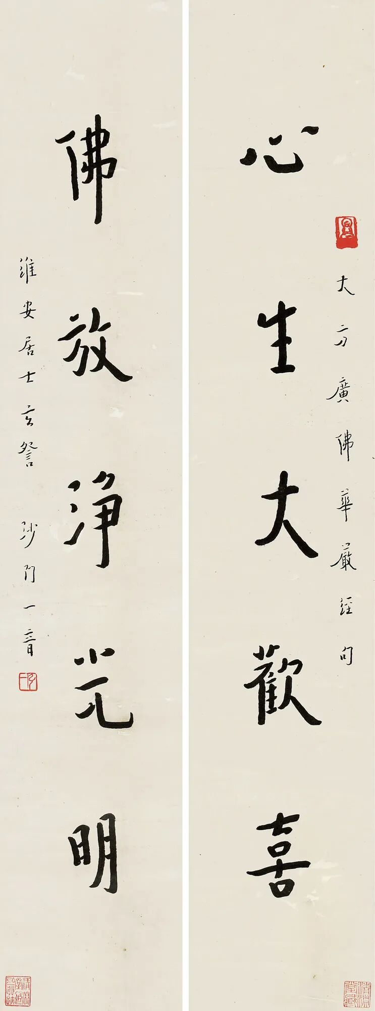 此幅对联为弘一法师中期书法的典型风貌,浩然正气一览无遗。“平划宽结,斜划紧结”,弘一书法早年取法《张猛龙碑》,笔意雄厚,气势开张,用墨滋润,结构精绝、奇正相生,一派北魏风骨。